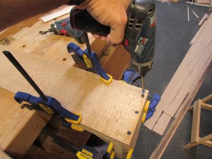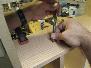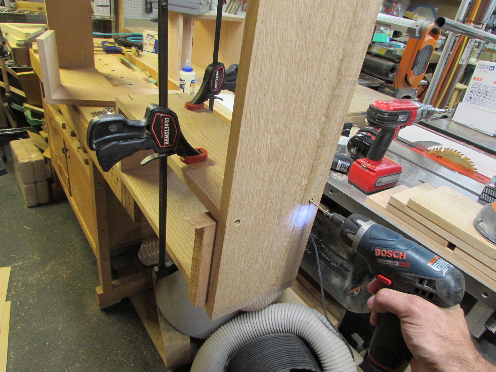 Once the shelves were located and clamped in place, I pre-drilled and counter-sunk them and attached them with 2-1/2″ wood screws. I also applied a bit of glue to the ends of the shelves. I am not sure if it will help anything, but it cannot hurt.