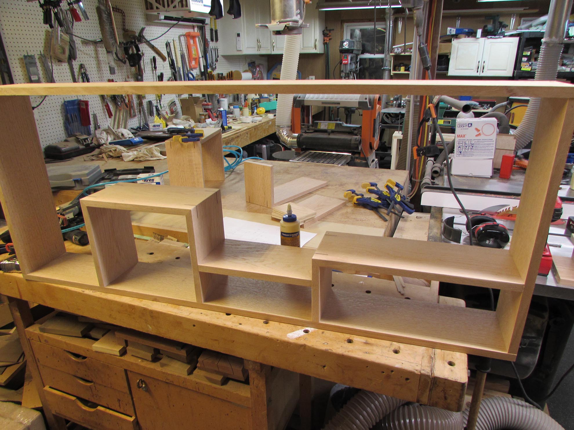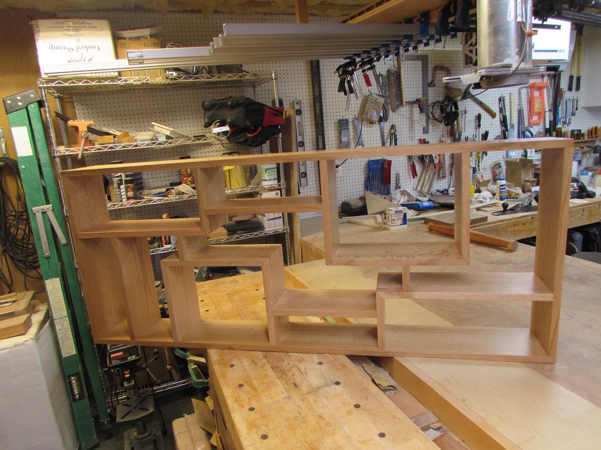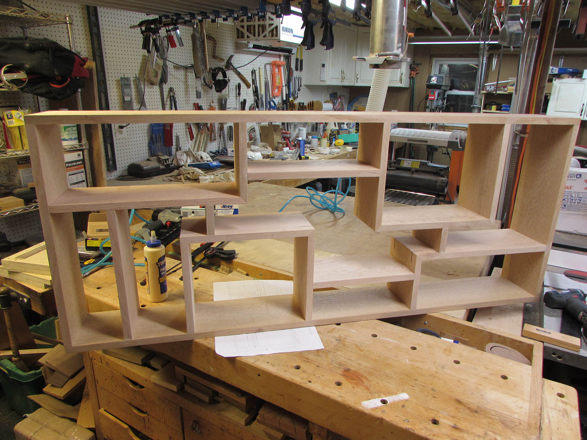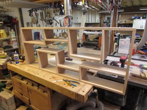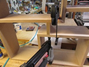 With the casing complete, I next need to install the shelves that were mitered together. The three-sided boxes were easy, but the “L” shaped ones required a spacer to hold the correct elevation.