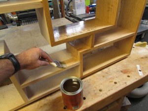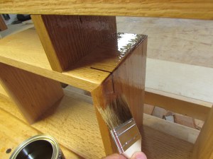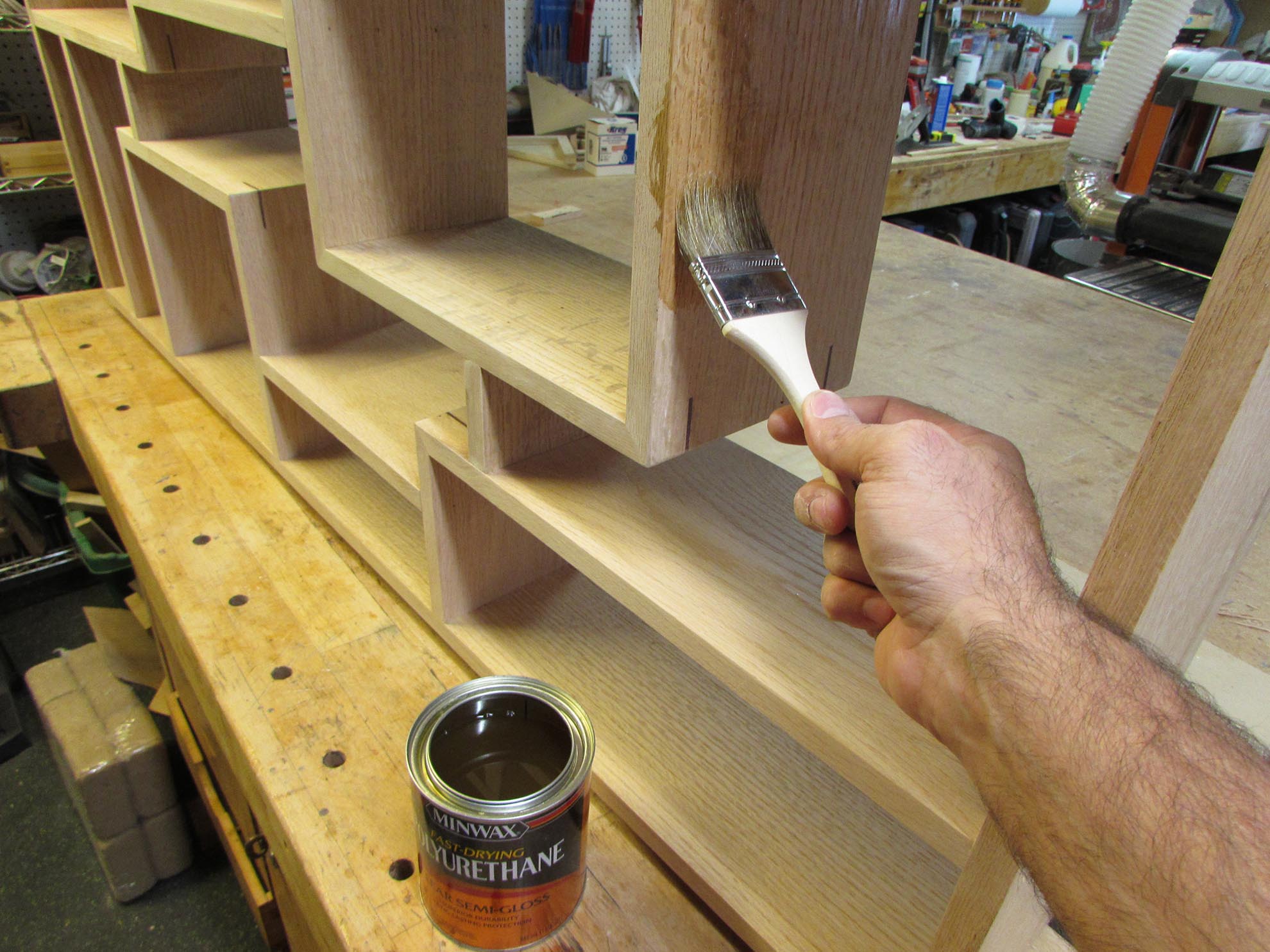 After the first coat, I sand the entire project with 400 grit paper to smooth all the finish down.