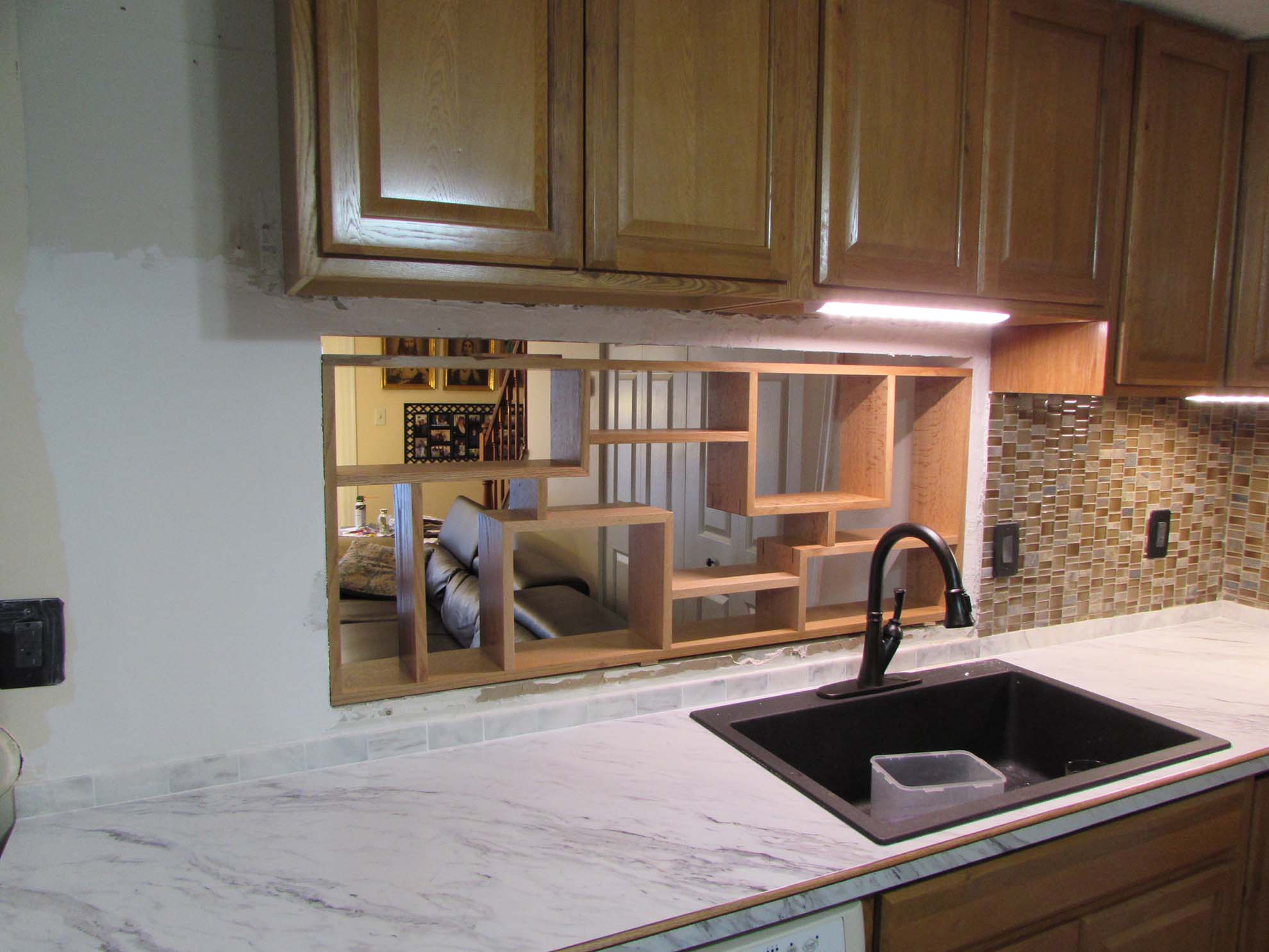 To finish my friend, Margie’s kitchen, she wanted to add some shelves to the kitchen pass-through window. We adjusted the opening to make it smaller, allowing for an additional cabinet to be installed. Once that was done, I had the dimensions to start. I asked Margie to give me a shelf layout on some graph paper while I acquired the wood.
