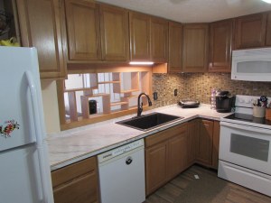 A few days later, after the fumes from the finish had dissipated, I installed the finished shelf in Margie’s kitchen.
