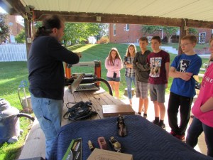 First thing we are going to do is plane all of our boards down to the proper thickness. I started with a brief lecture comparing the various types of planes that I have in my shop. I brought several examples of hand planes, some vintage and some new. One was a wooden plane that my son made a couple of years back. I also brought a hand-held power planer as well as my Rigid, lunch box planer. I pre-cut all of our boards to width but left them all in their rough cut state so the teens would have a lot of planing to do.
