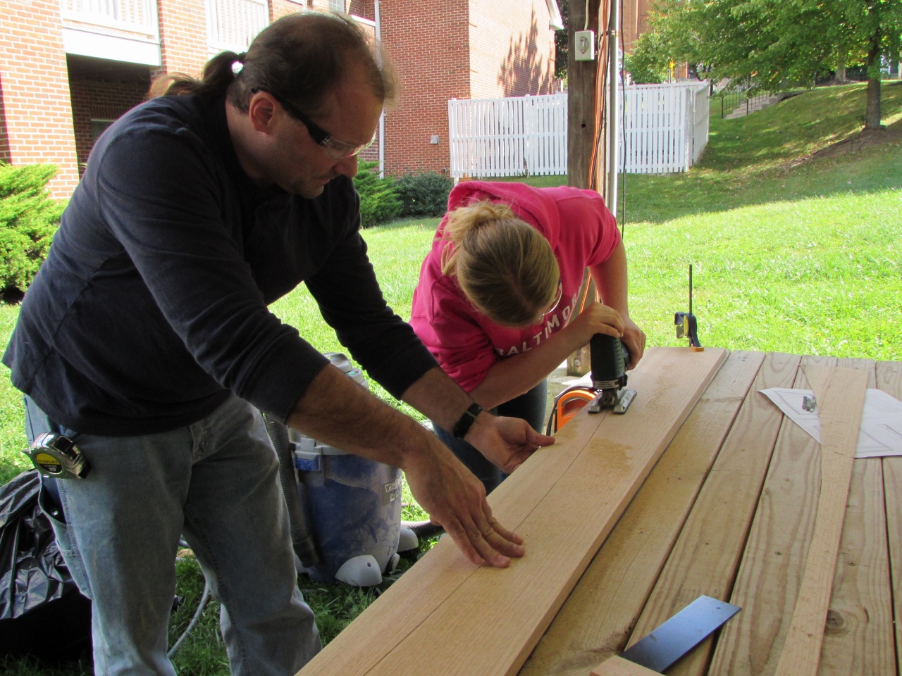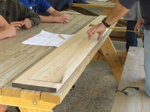 After testing it on the wall, I determined that it was way off. My test piece was 1-1/2″ too deep. This gave me an opportunity to show the teens how to scribe a new curve by bending my test pattern, and tracing the bow of the piece of wood, at the new location.