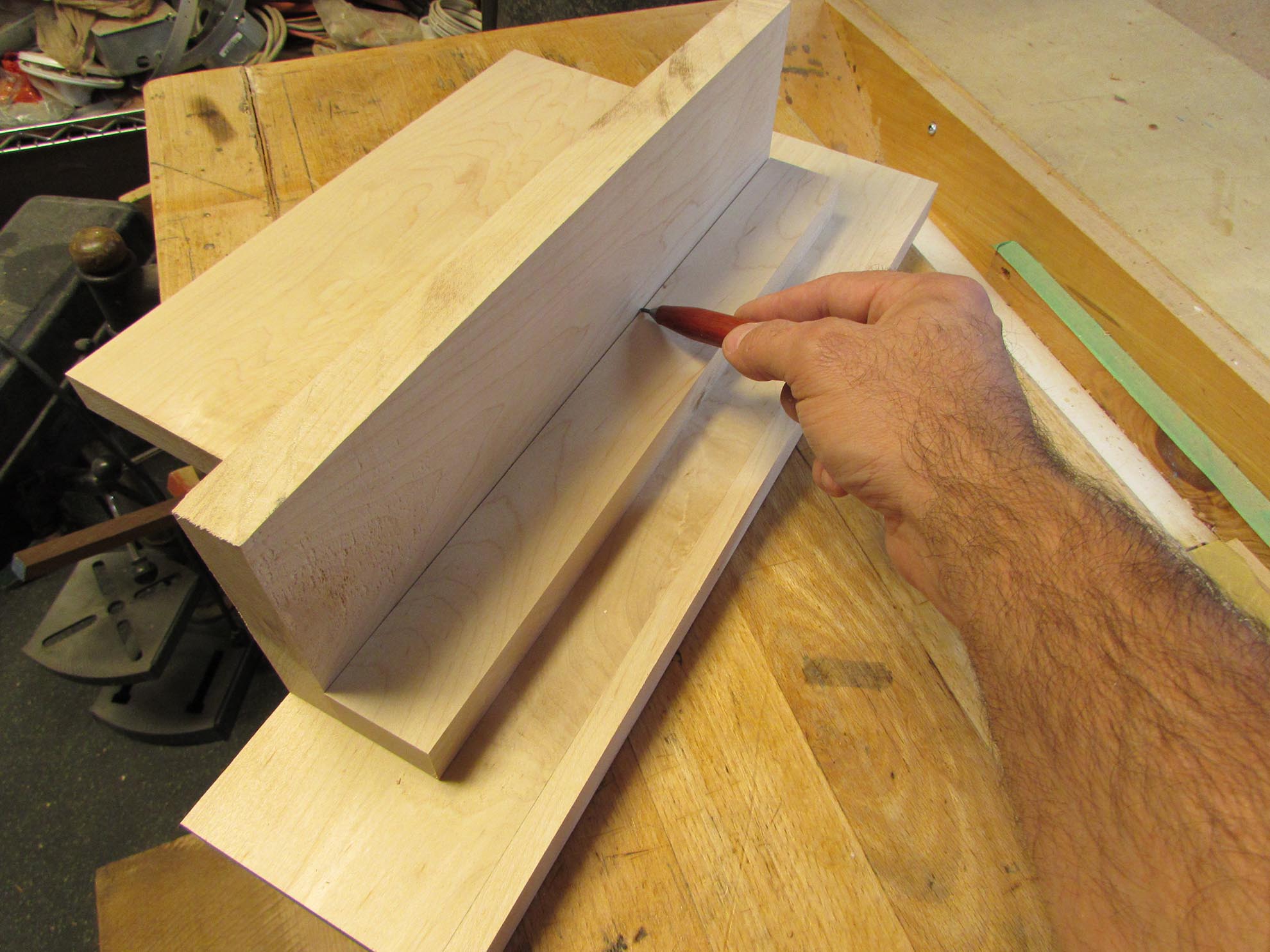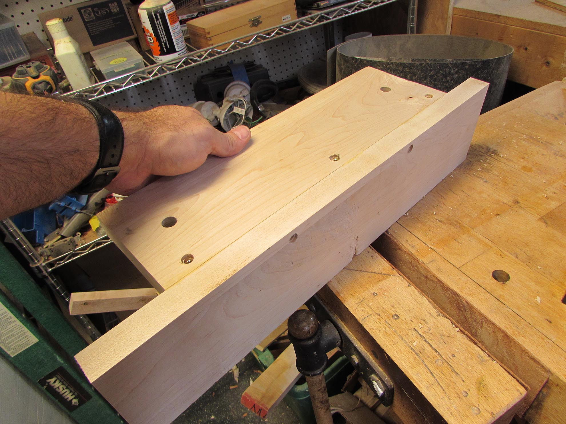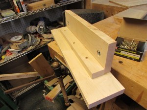 I have a few chunks of maple left-over from the maple & purpleheart crib build, so I started cutting them down. The jaws of the vise are 15″ long X 4-1/2″ tall, and about 1″ thick. I cut the base 6″ longer to leave room for clamping.