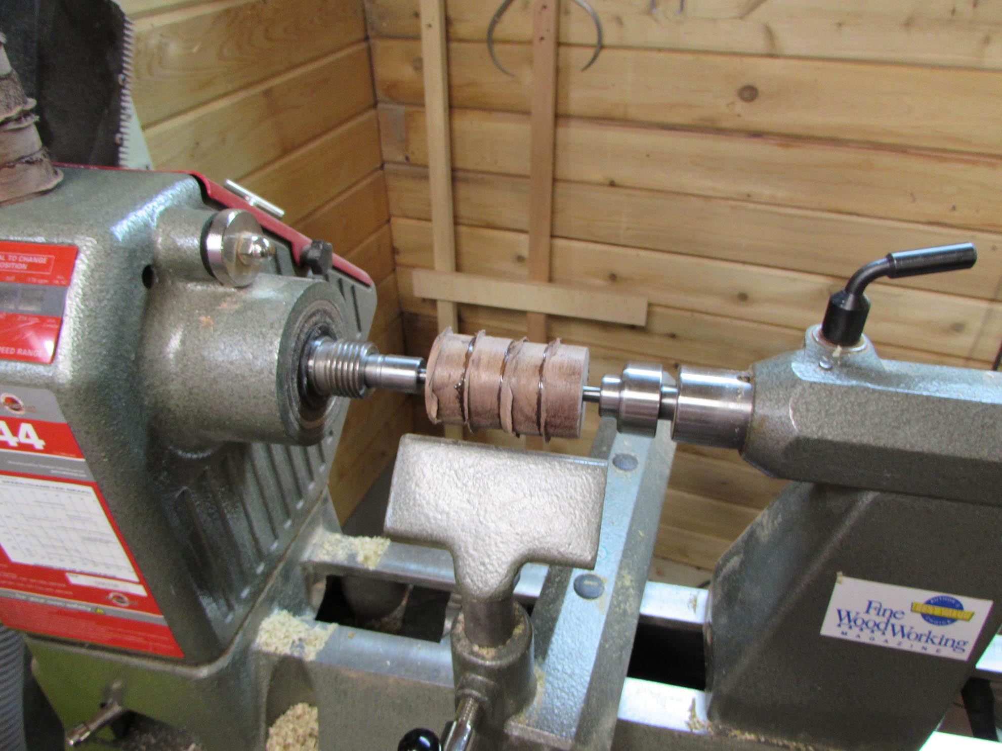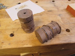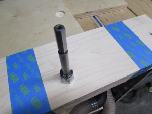 The handles are going to be made from all of the left-over slugs from the Beer flights I made a while back. They were from the holes that were cut with a hole saw. I glued them up, four at a time, for my wife to play with, on the lathe. The threaded rods were 12″ off-cuts, left-over from the last addition I built. I used 1/2″ all-thread to attach wood to my steel beam. The threads are a bit fine, so it won’t be a fast vise, but it also won’t cost me anything, so I can be a little more patient, opening and closing the vise.