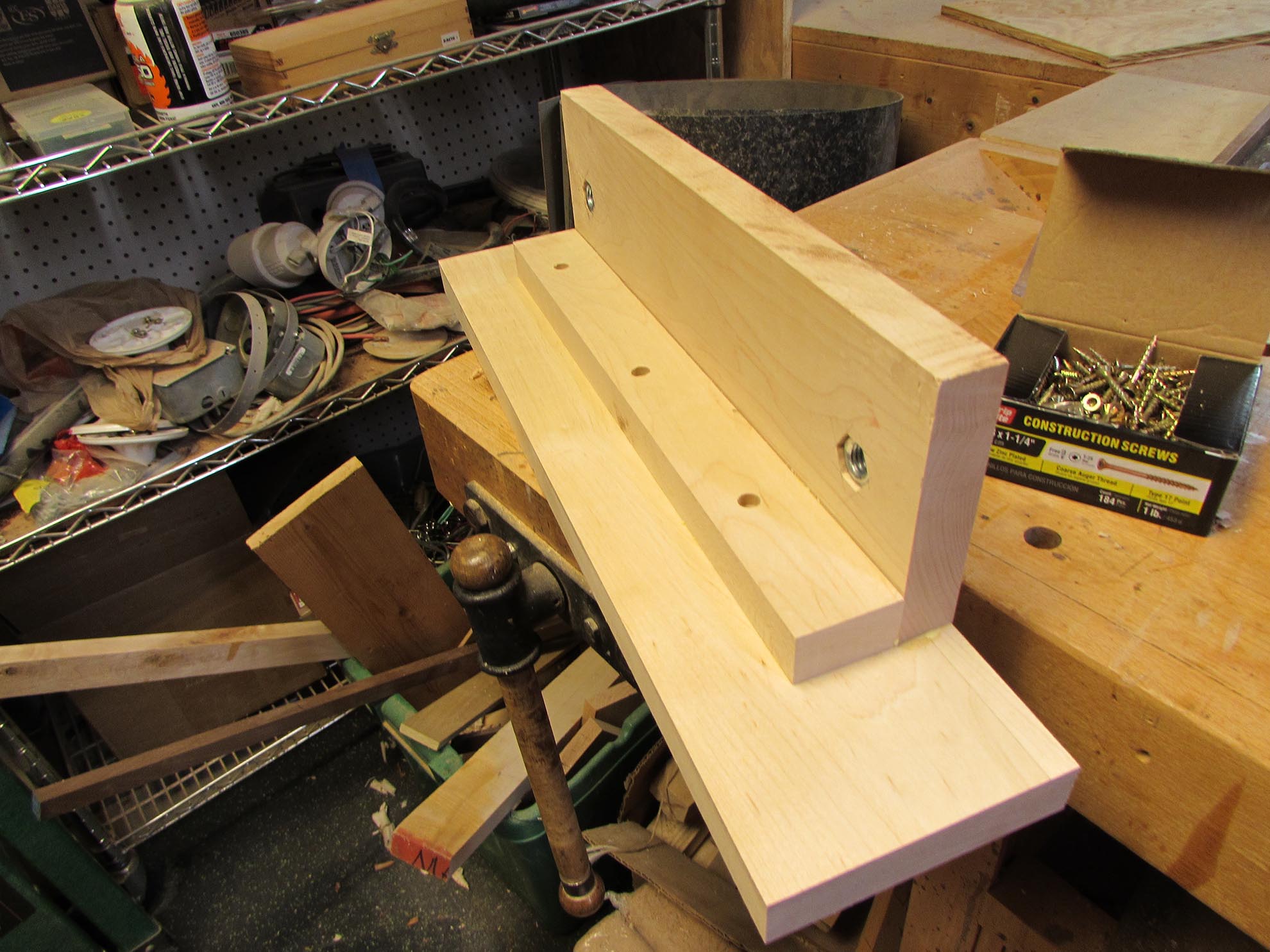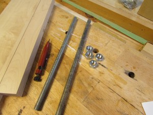 I am going to need something to clamp wood into, for this class I am teaching. I need to hold wood in a vertical position so the teens can cut it with a hand saw. I searched the web for a few different approaches and decided on a Moxon vise. I have scraps of everything I need to build one, just lying around the shop. I could spend a lot more money to get hardware that would make the vise better, but I just need a simple clamp, so scrap it is…