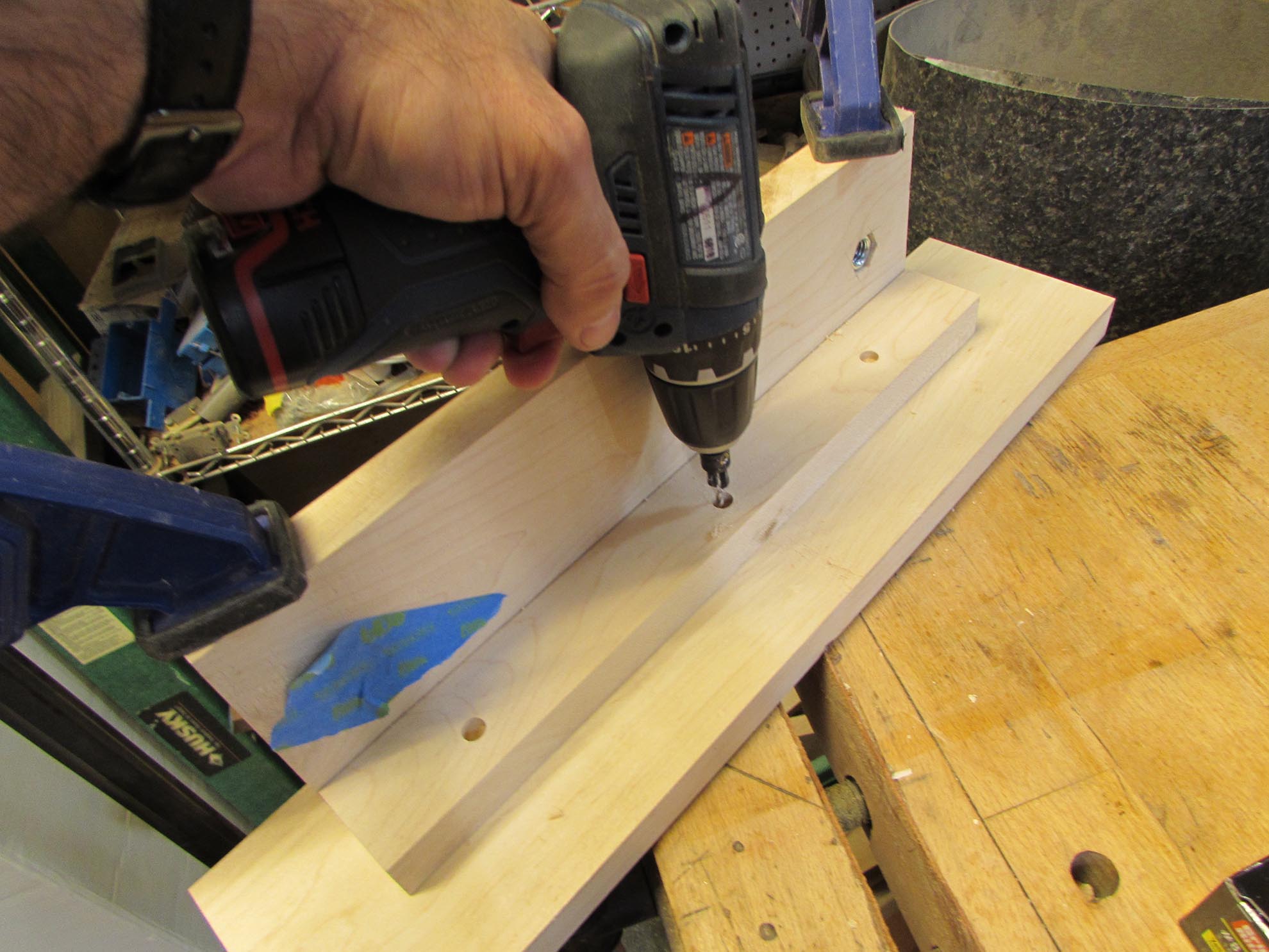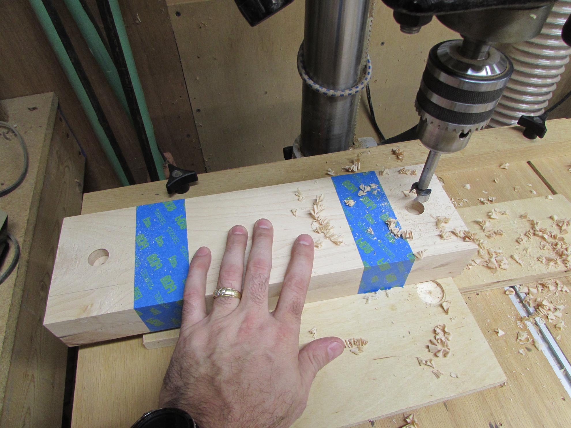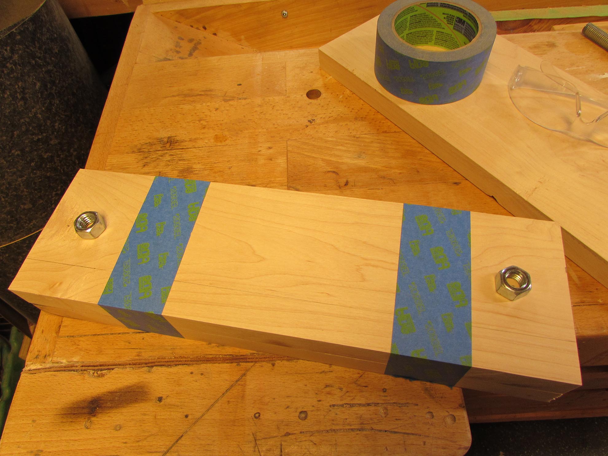 I taped the two jaws of the vise together to drill pilot holes for the rods and nut pockets.