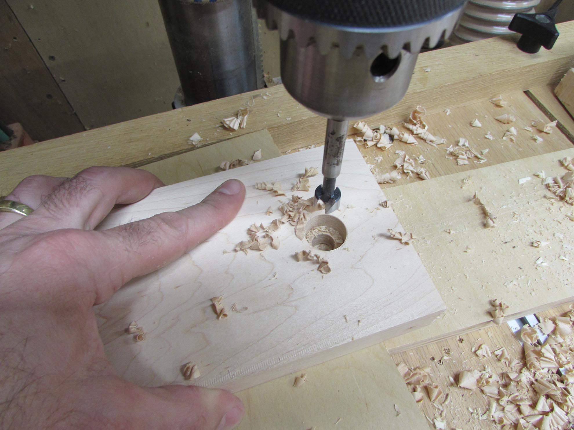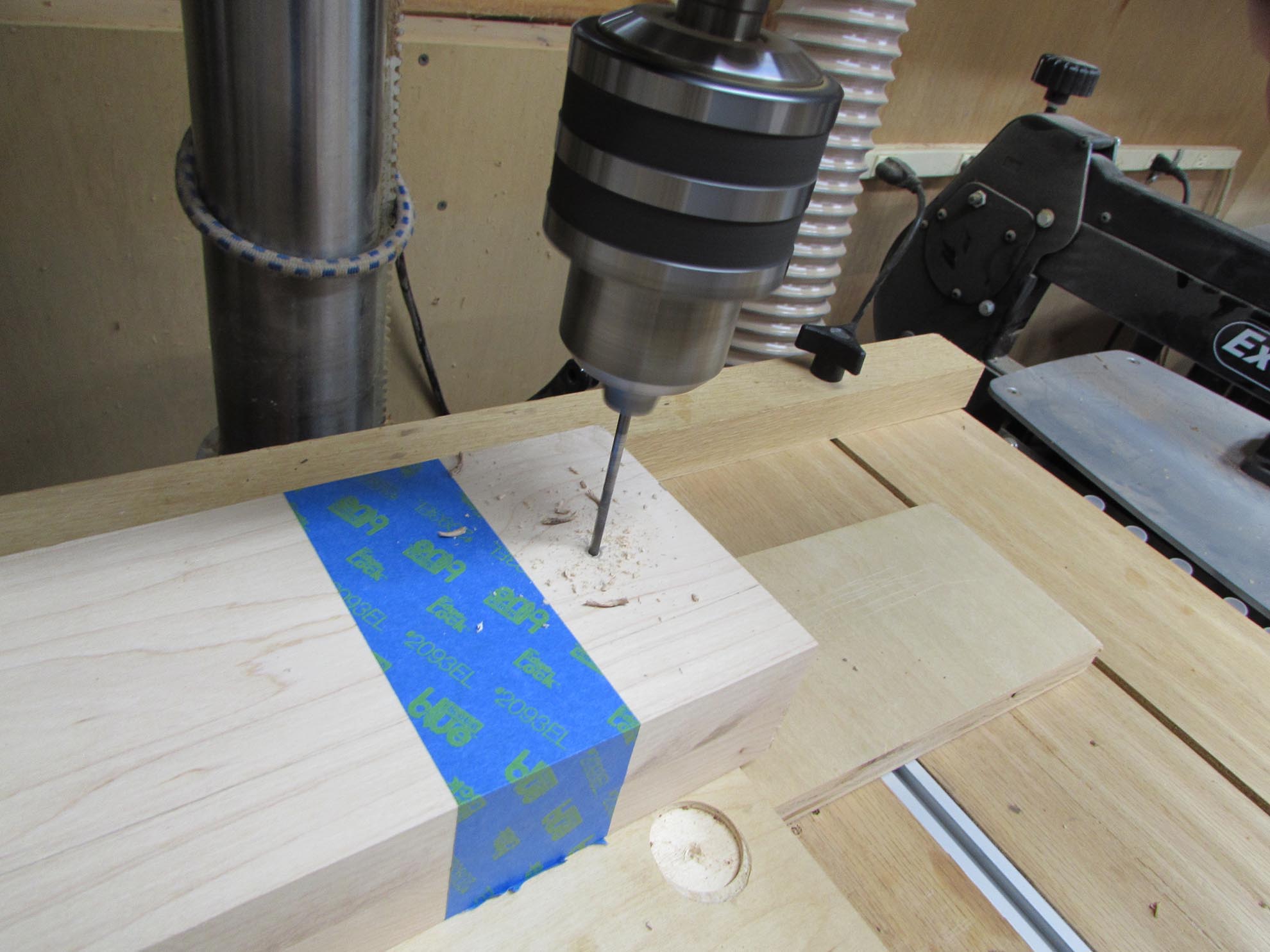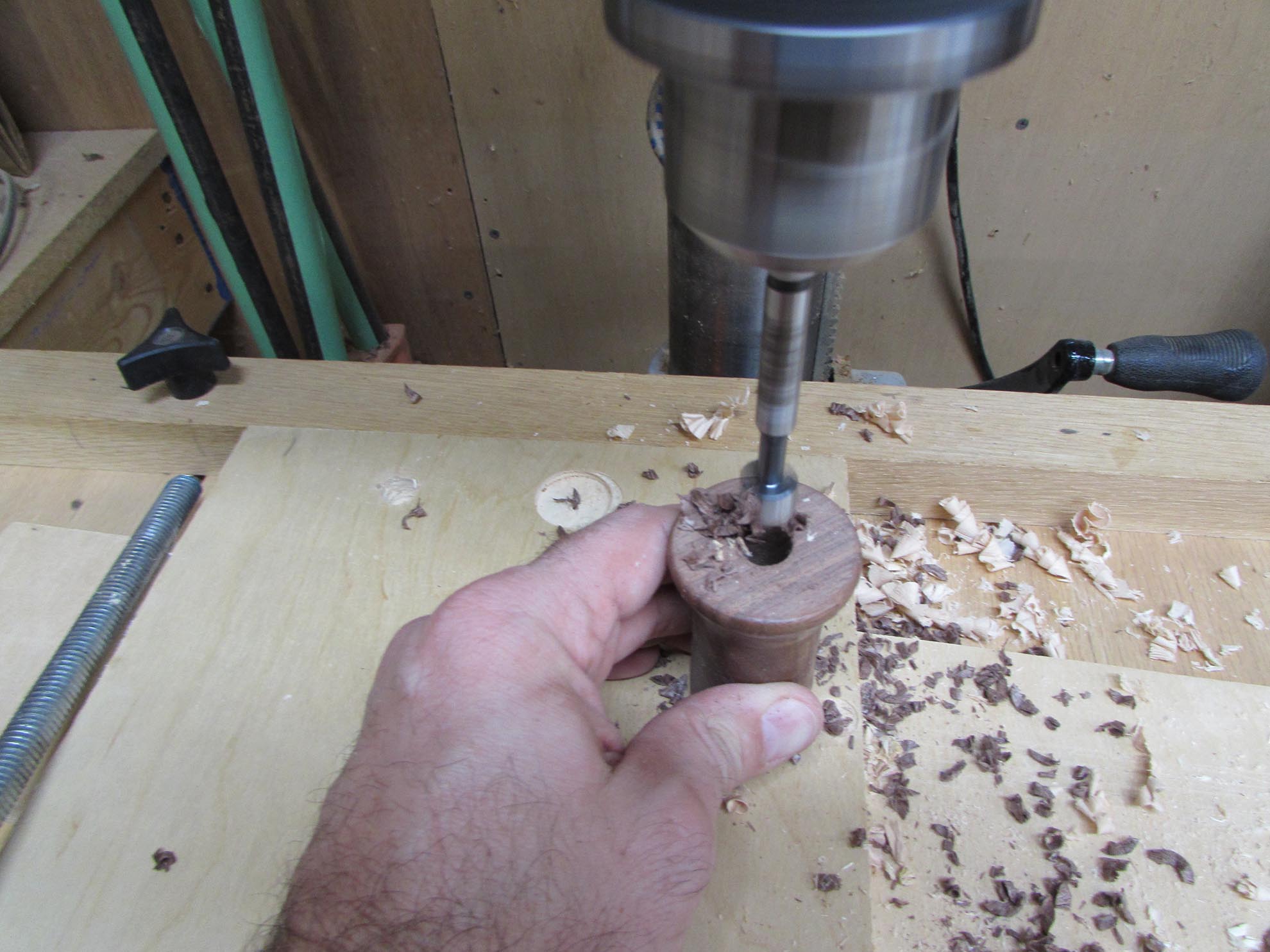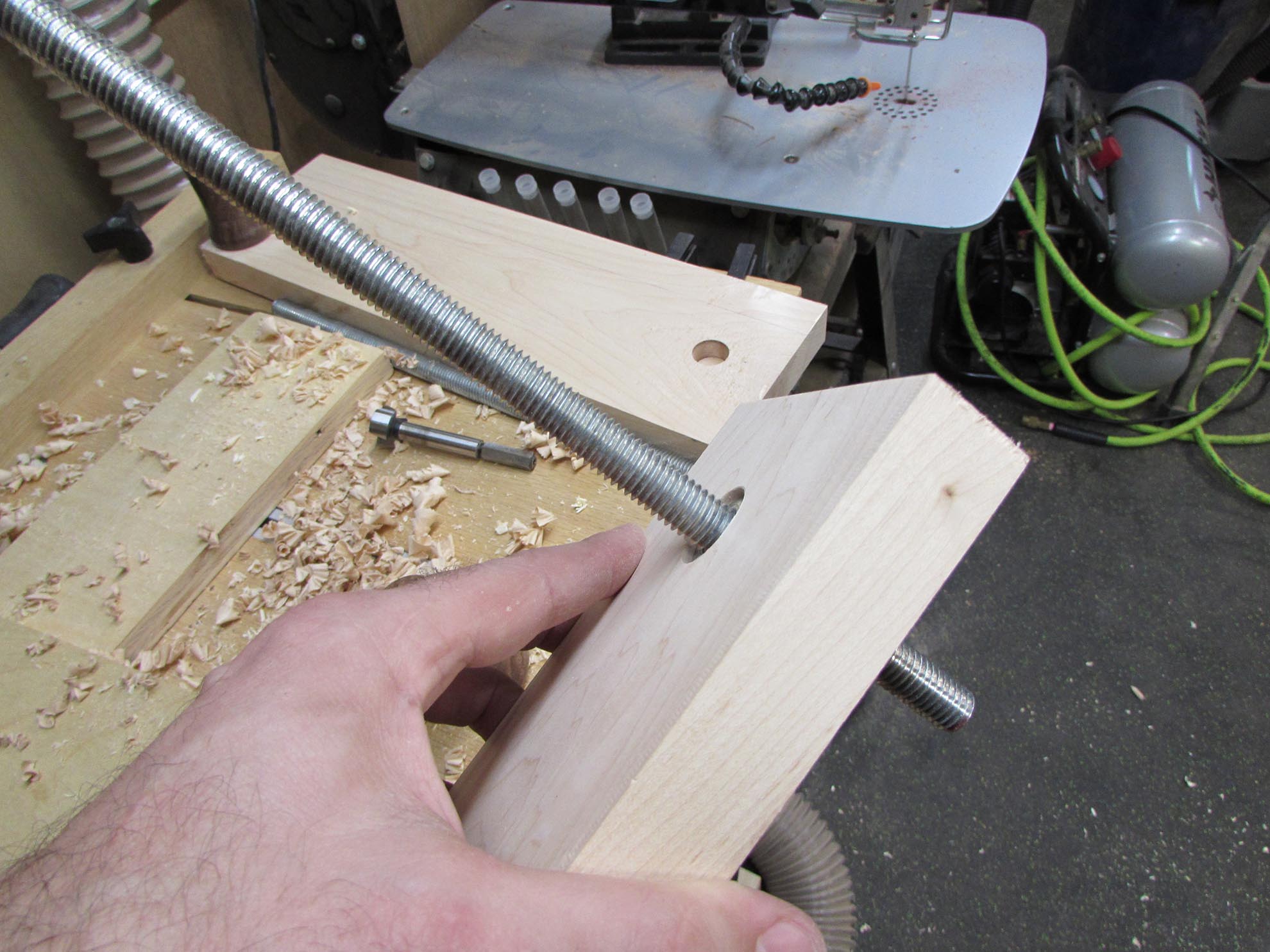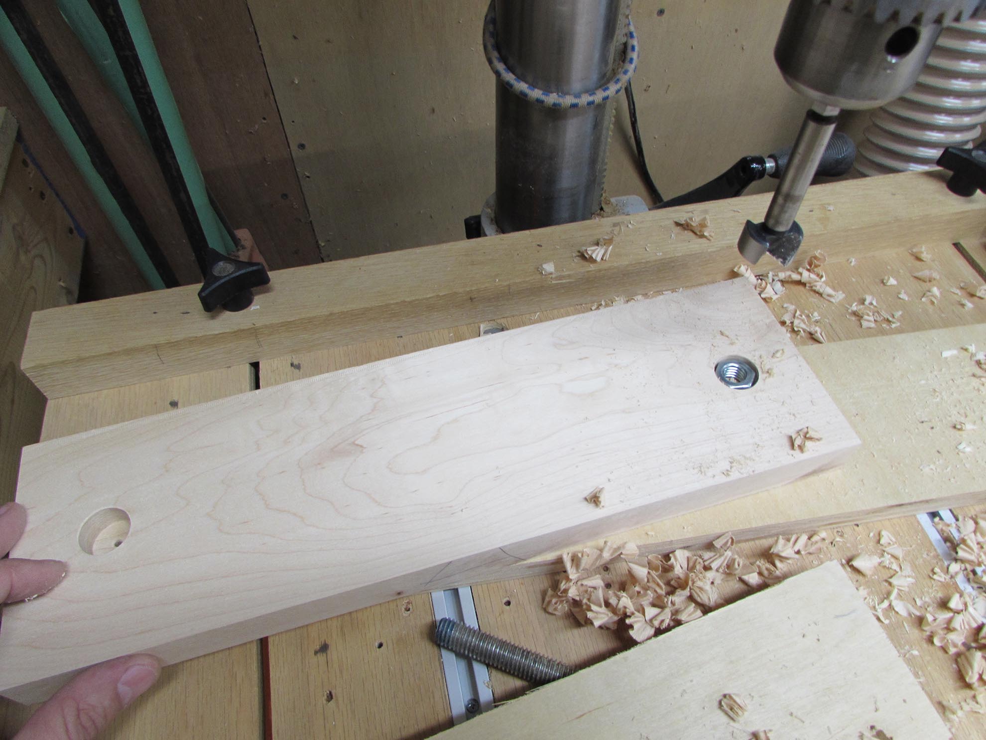 On one jaw, I need to press-fit a nut in, so I drilled a hole that was smaller than the nut. I will chop out the rest with a chisel later.