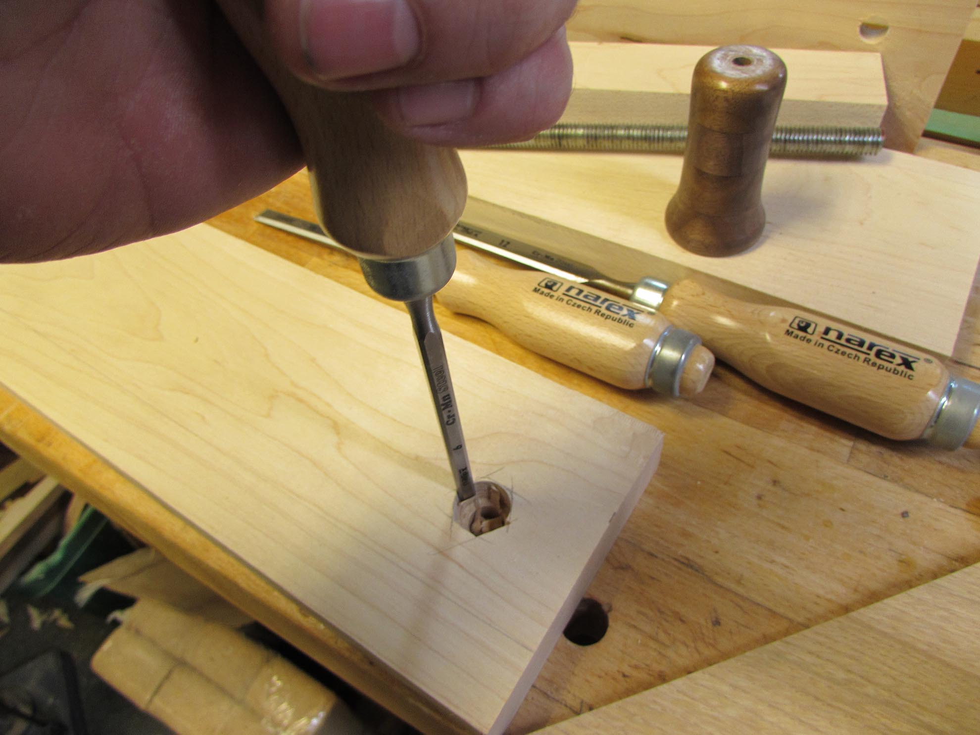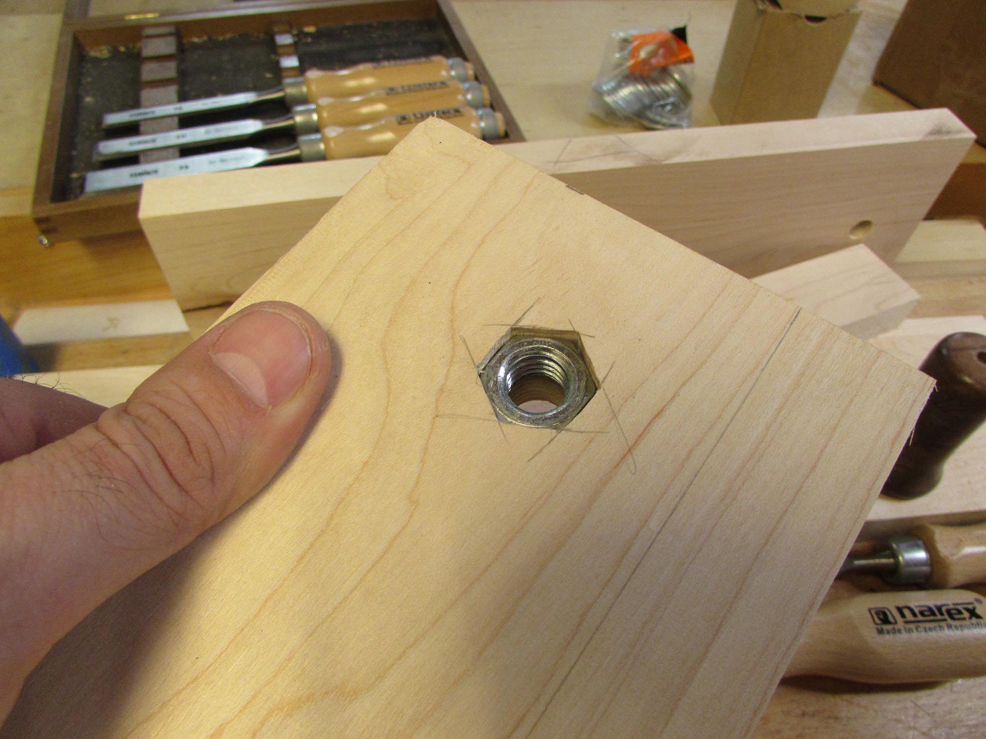 I used my 1/4″ chisel to carefully cut out the hex shape of the nut. The nut was pressed firmly into place. The tight fit will keep the nut from spinning.