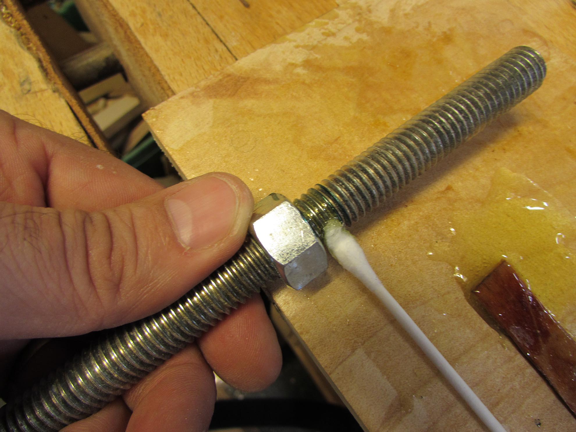 I set two nuts on the handle side, then marked their locations. These will be epoxied to the rod, to act as a stop. I did not require the hex shape of the nut at this end, pretty much anything larger that the rod would do, but I had a bunch of the nuts, so I used them.