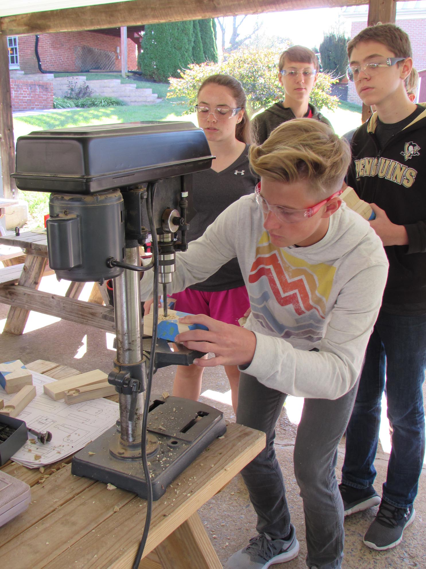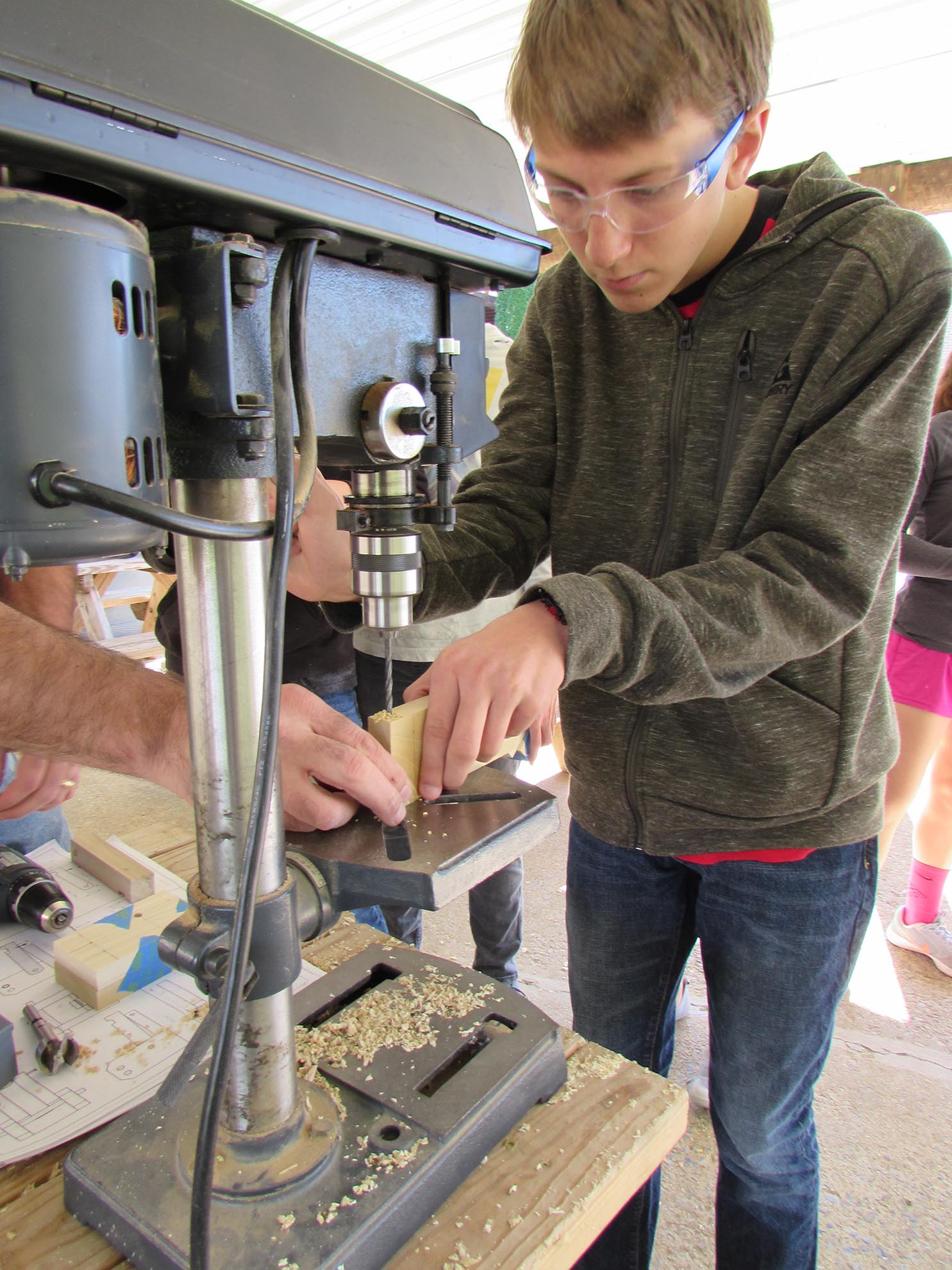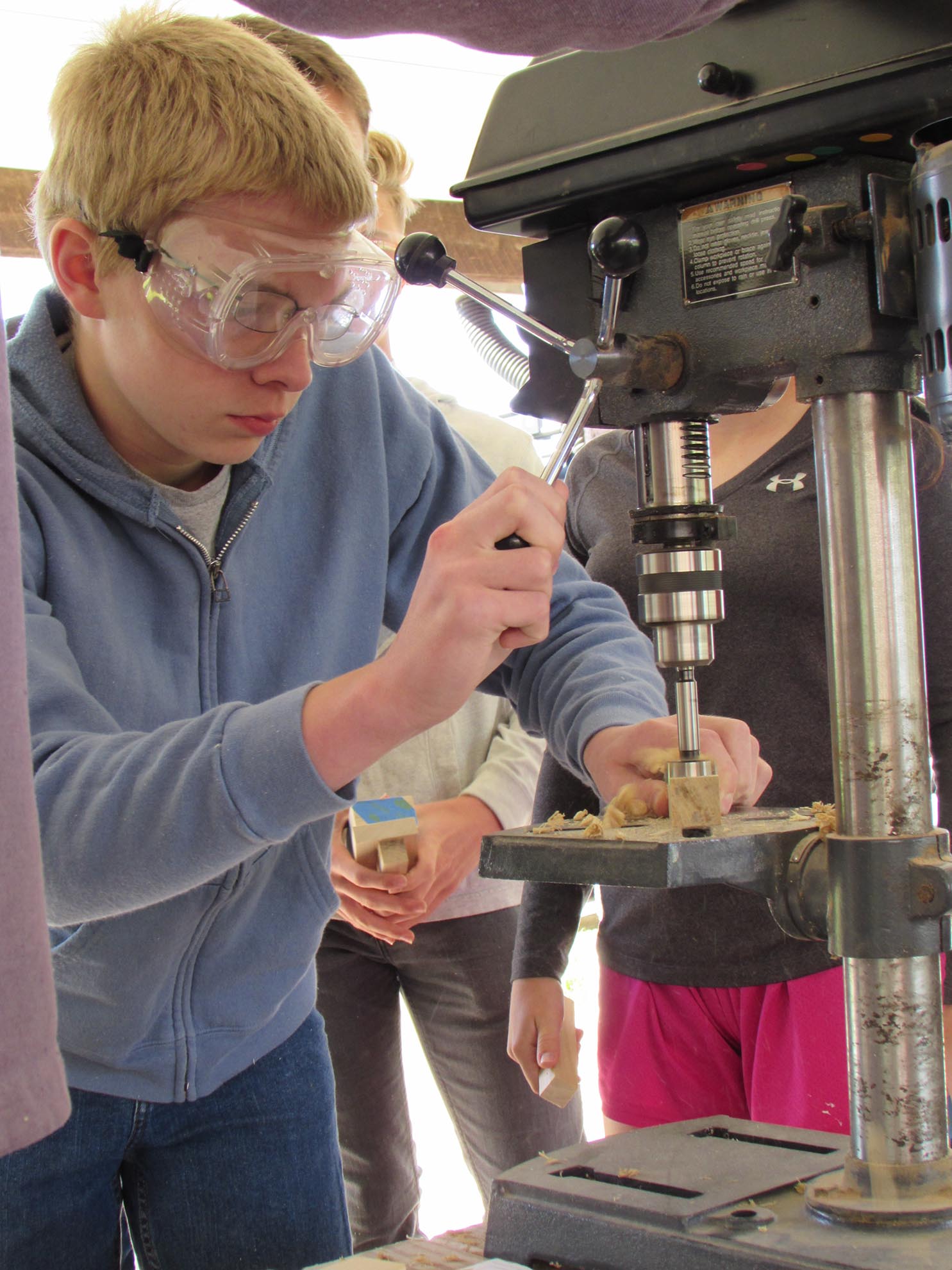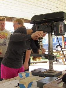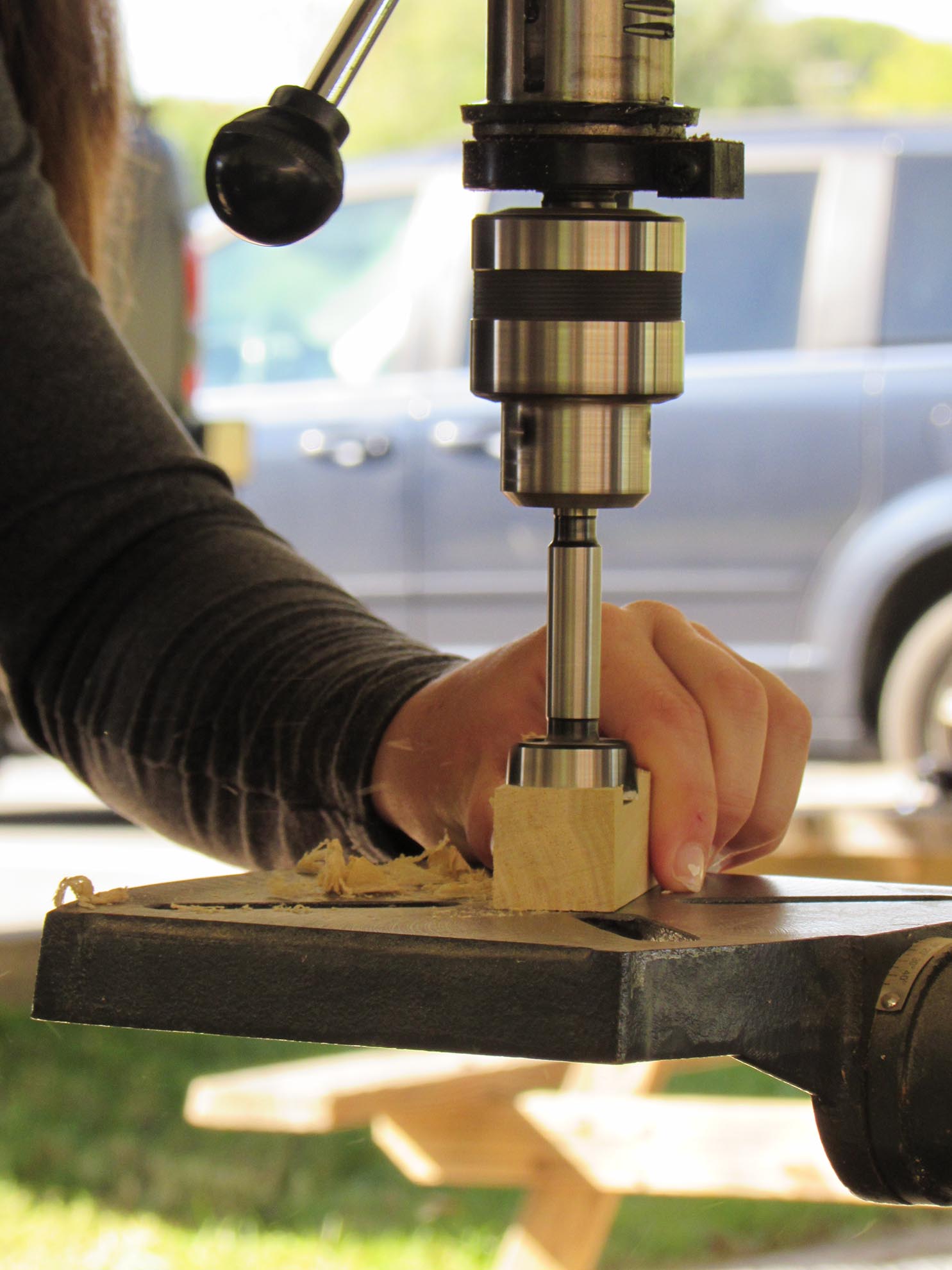 Since we were done the cutting and layout phase, I could start one of the teens on the lathe, pulling her away from her pen to drill holes as the drill press was set up.