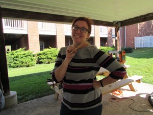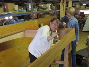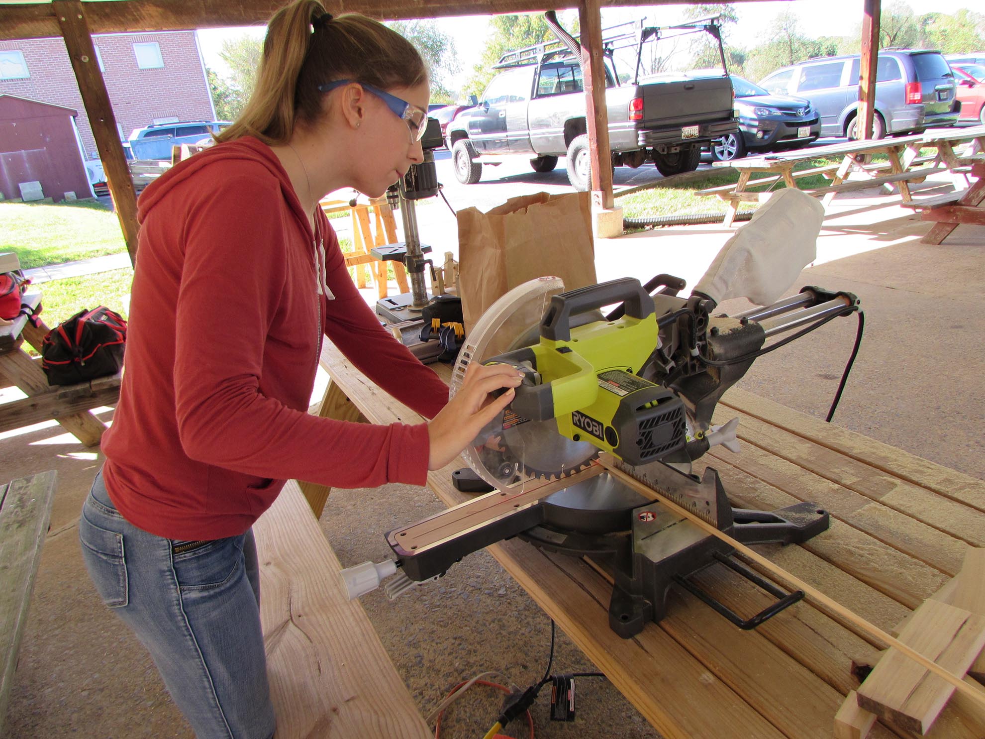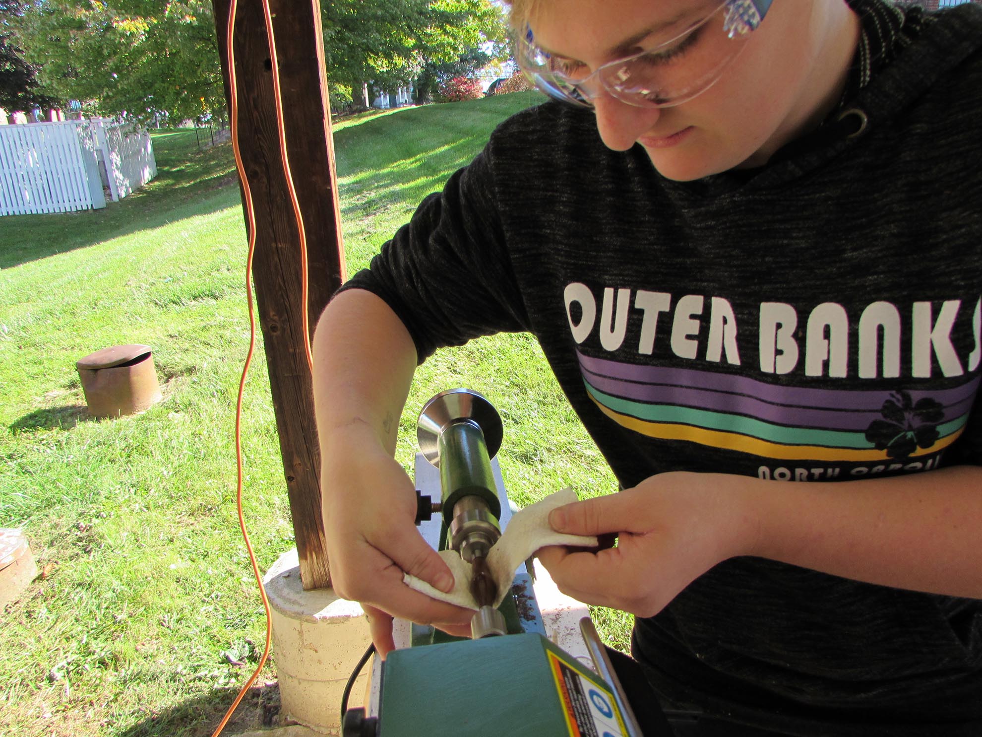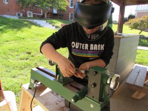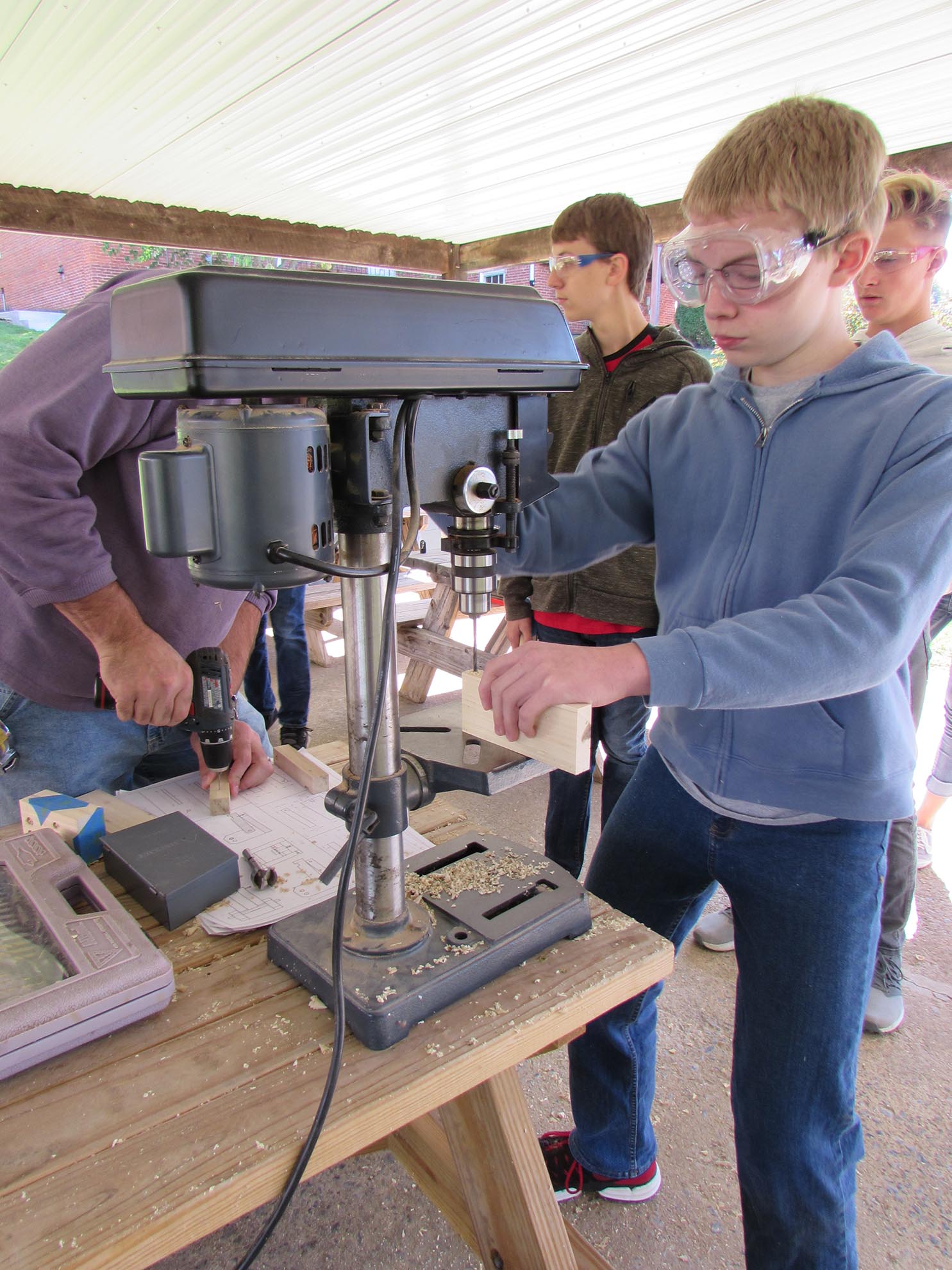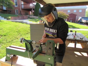 Since we were done the cutting and layout phase, I could start one of the teens on the lathe, pulling her away from her pen to drill holes as the drill press was set up.