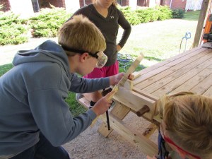 After all of the holes were drilled, we moved over to the Moxon vise, and started cutting out the slot in the base. I intended to have them drill a hole at the bottom of the slot, to cut down to, but we ran out of time. I had them cut both sides of the 1″ deep slot with a pull saw, and I will finish cleaning out the slot this week at home, so they can finish assembling their catapults next week at our last class.