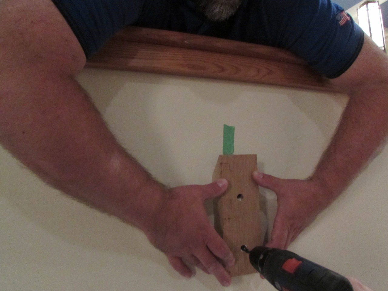 Ryan hung over the balcony to hold the cleats in place for me to drill the pilot holes.