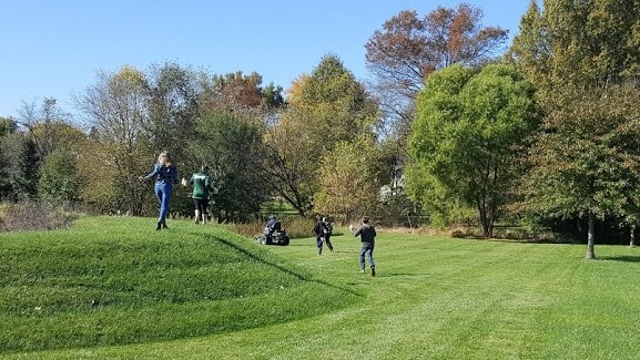 When we saw my buddy Ryan ride by on his mower, I sent the kids to attack him with marshmallows, and to thank him for helping to hang the picture.