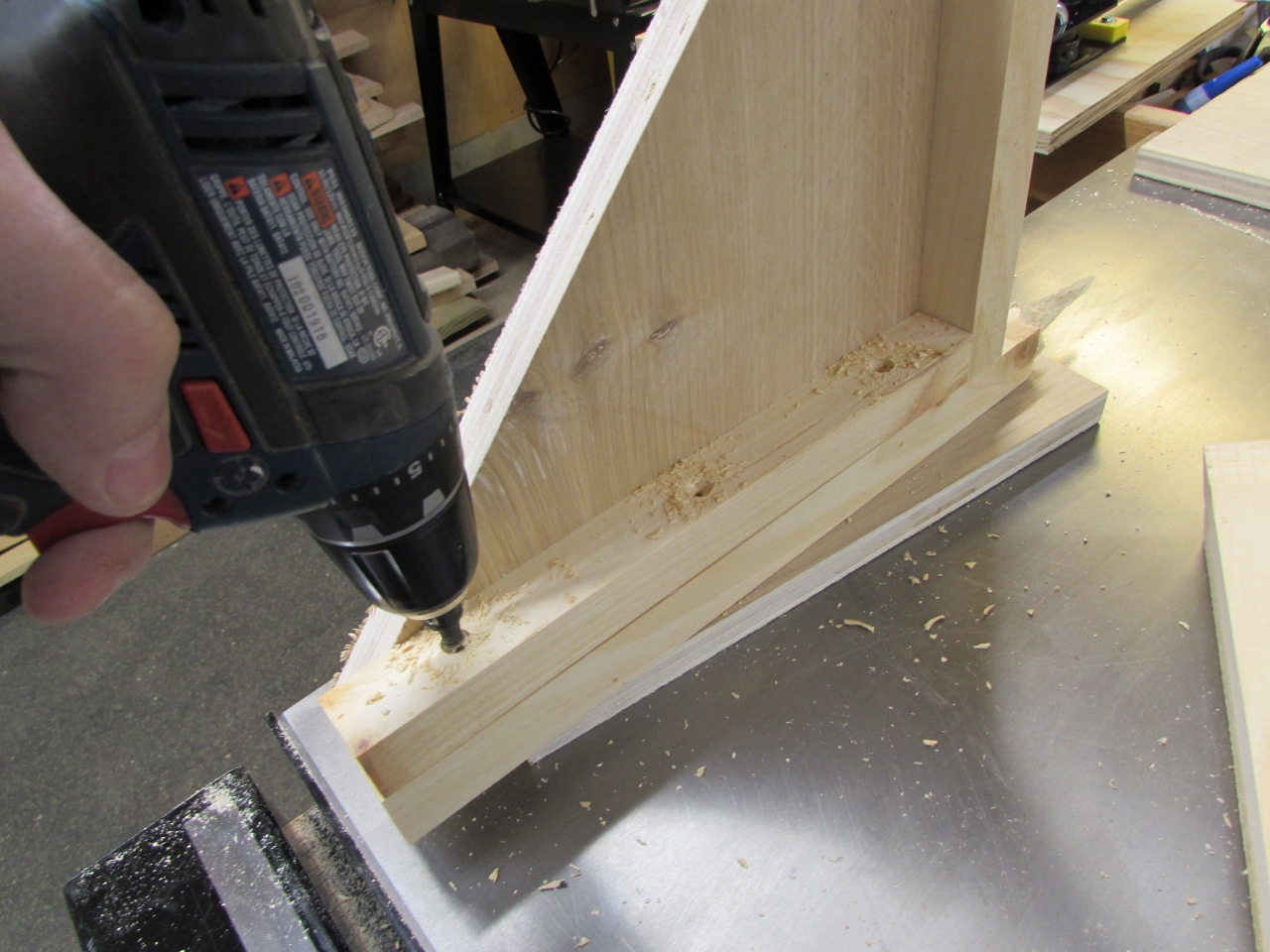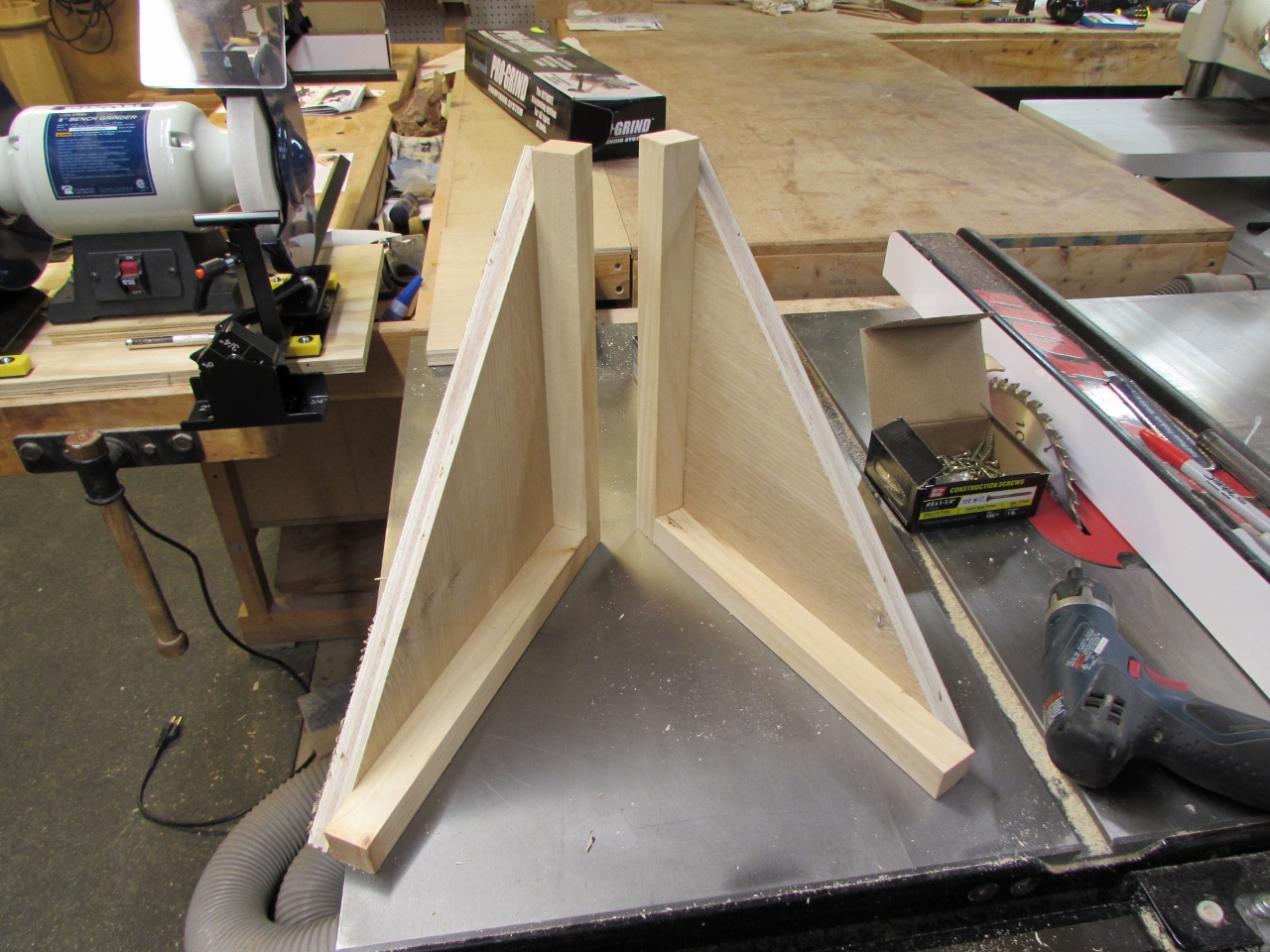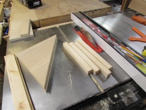 I am going to use simple gussets . I started with a 12″ x 12″ piece of plywood, and cut it into two triangular halves.