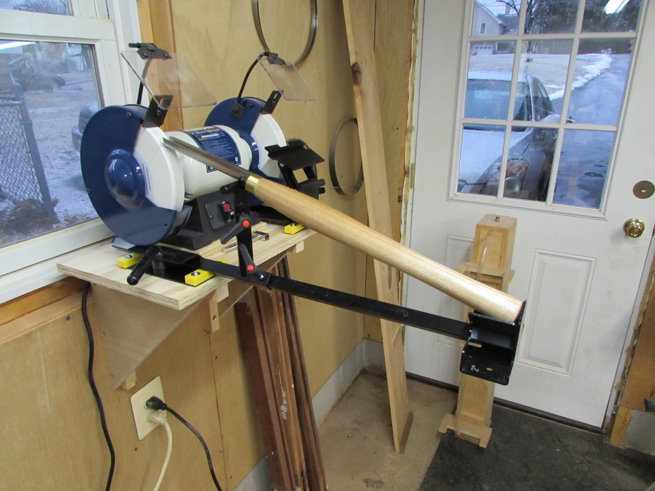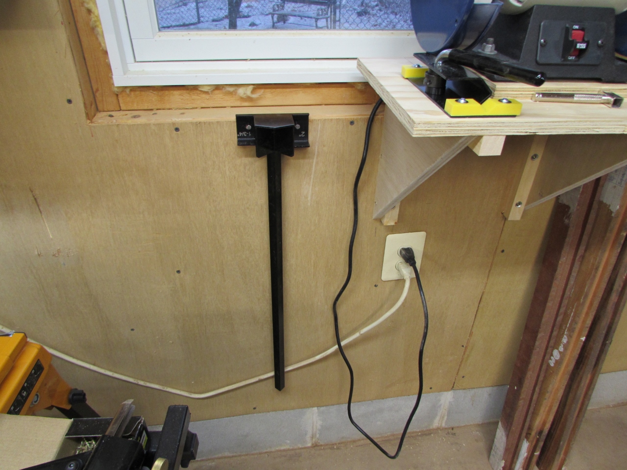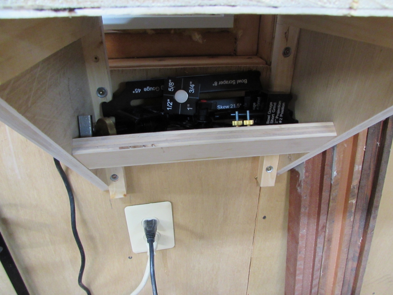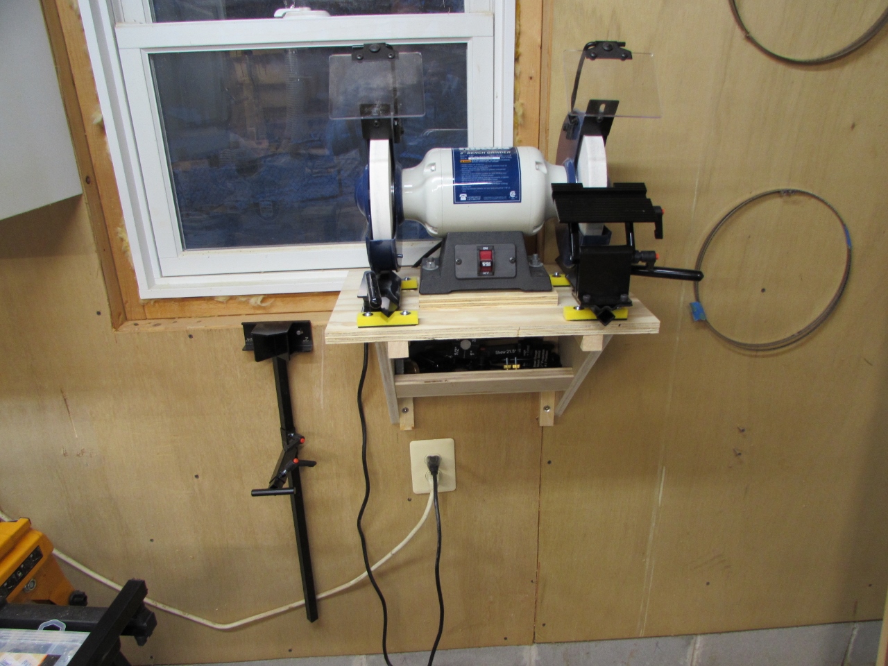 Now, I have to figure out what to do with all of the parts, that are used to determine the proper angles and locations of the jigs. The long arm thingy can just hang on the wall, from two framing nails, but the rest needs a shelf that will not collect metal dust from the grinder.