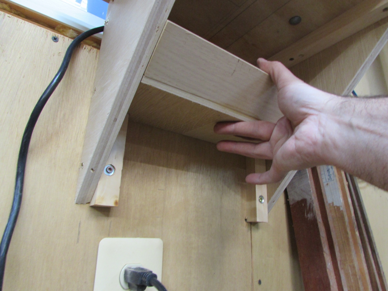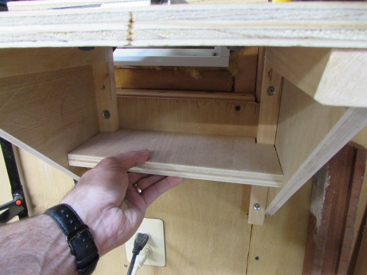 I cut and notched a small shelf from another scrap of 3/4″ plywood. It was only about 5″ deep so it stayed several inches shorter than the shelf above. hopefully this will shelter everything from the dust.