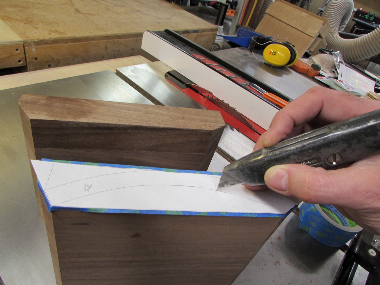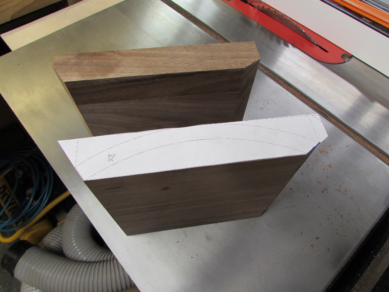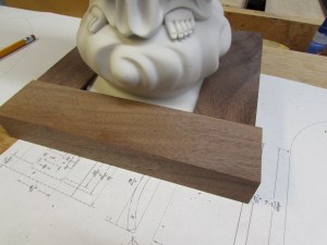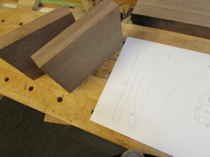 I started by printing out a full-scale pattern, and cutting two blocks of walnut, that were about 1-1/2″ thick.