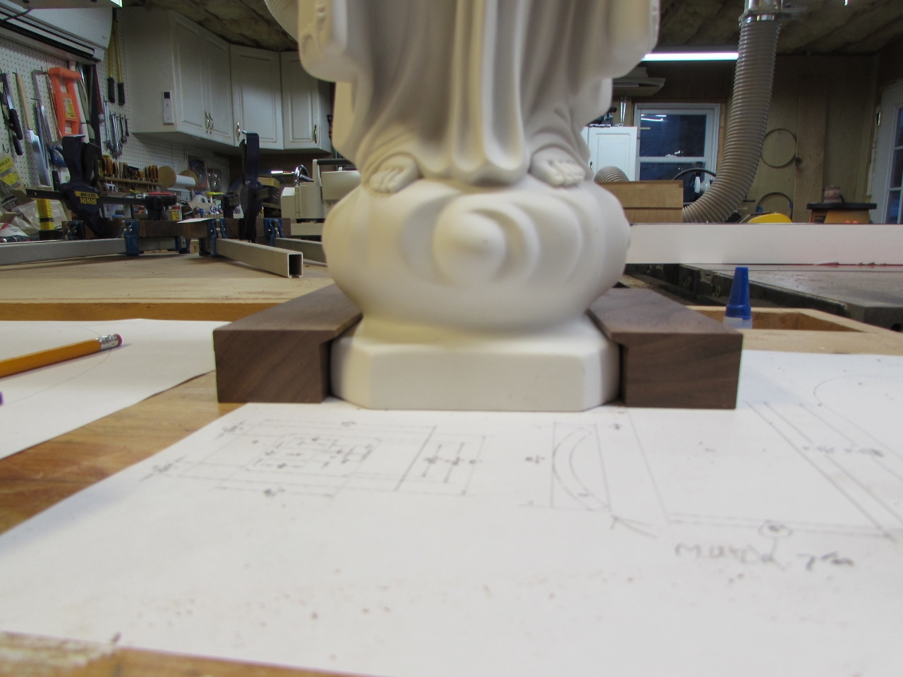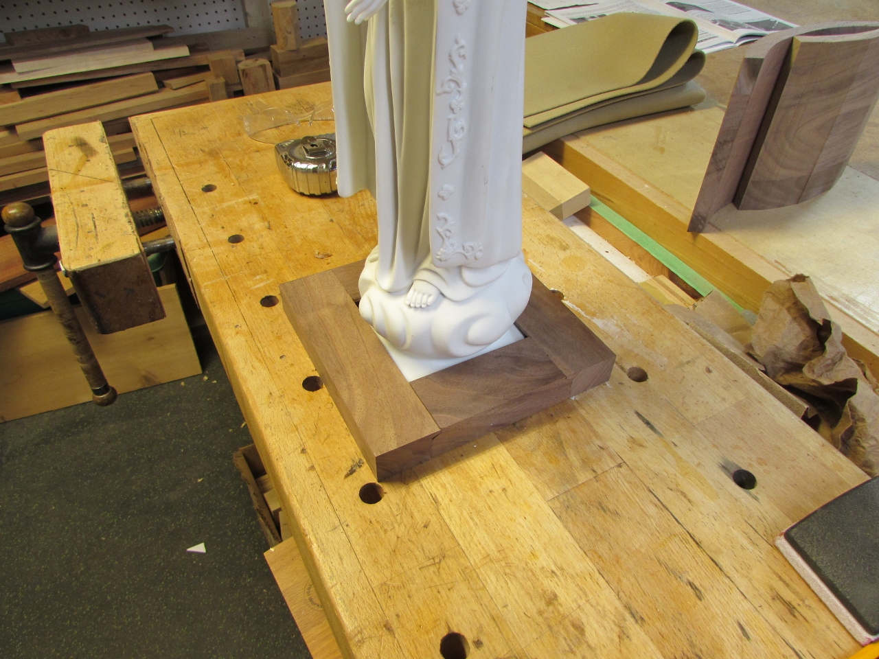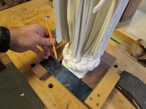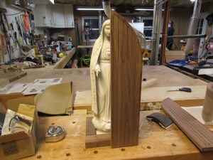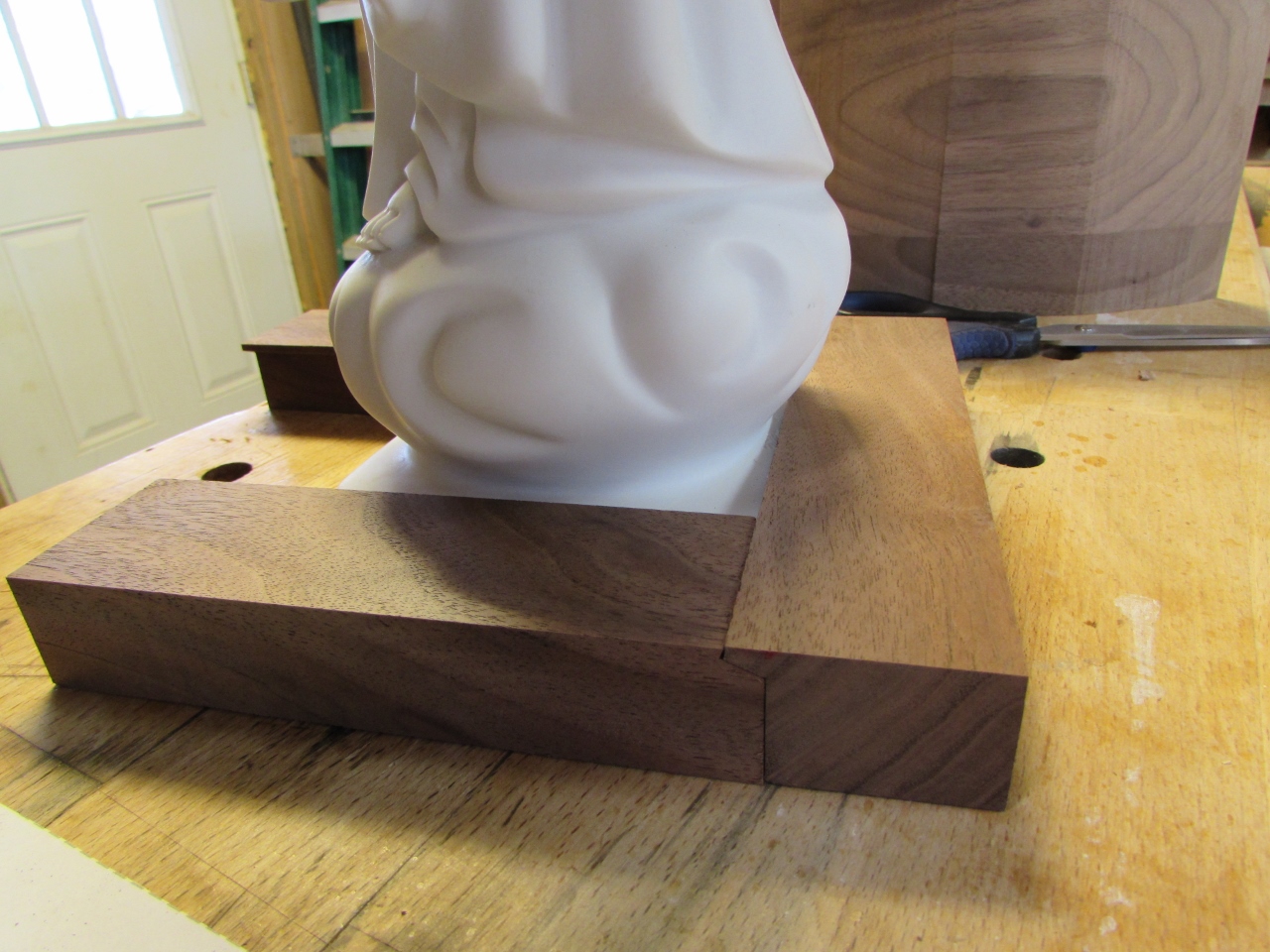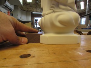 While that was drying, I decided to tackle the problem of securing the base of the statue. I did some test cuts on a scrap block to try to match the profile of the base. My goal is to completely capture the statue base. Three sides will be permanently attached, and the fourth will be screwed in, so the statue can be removed, if needed.