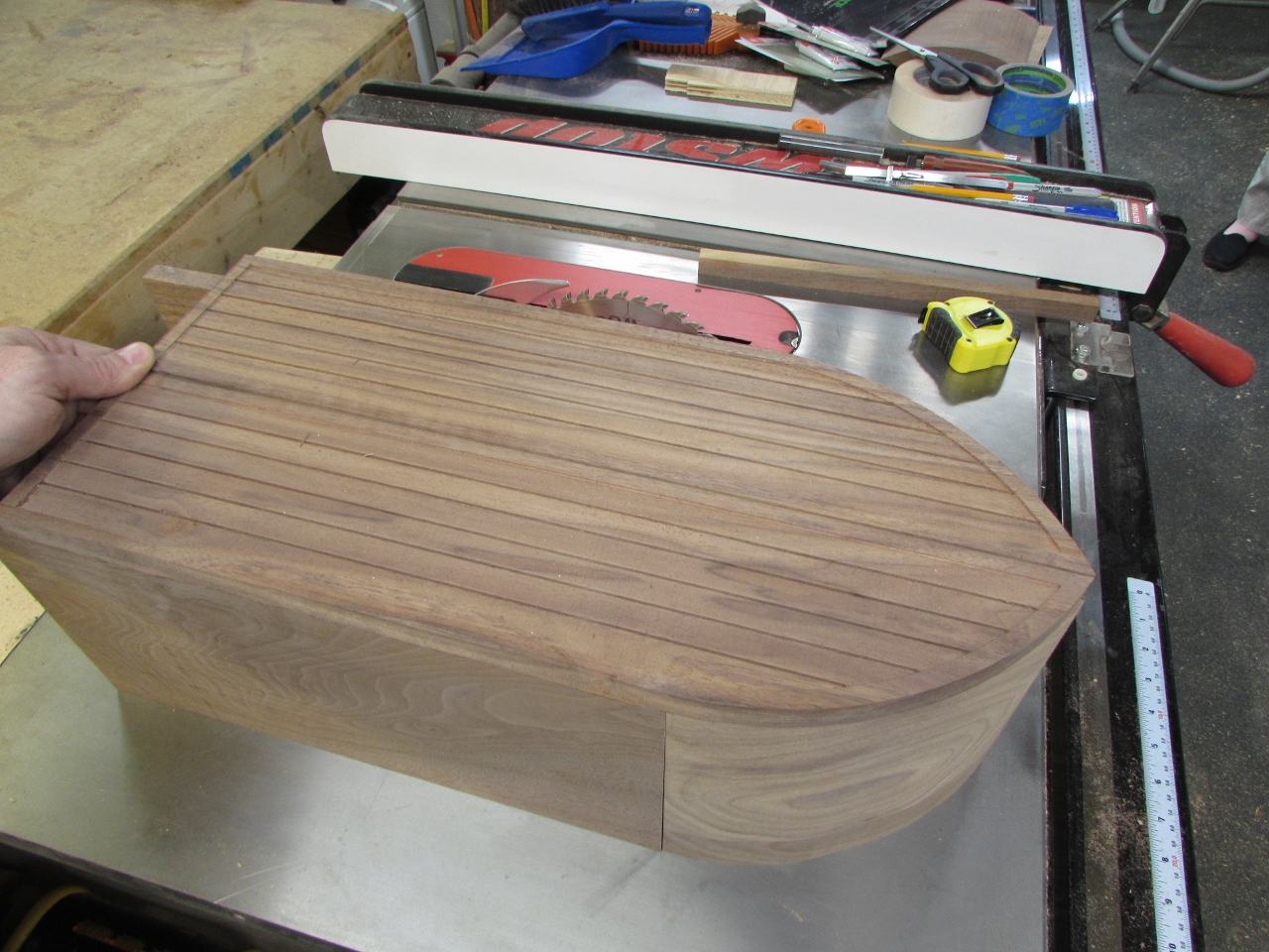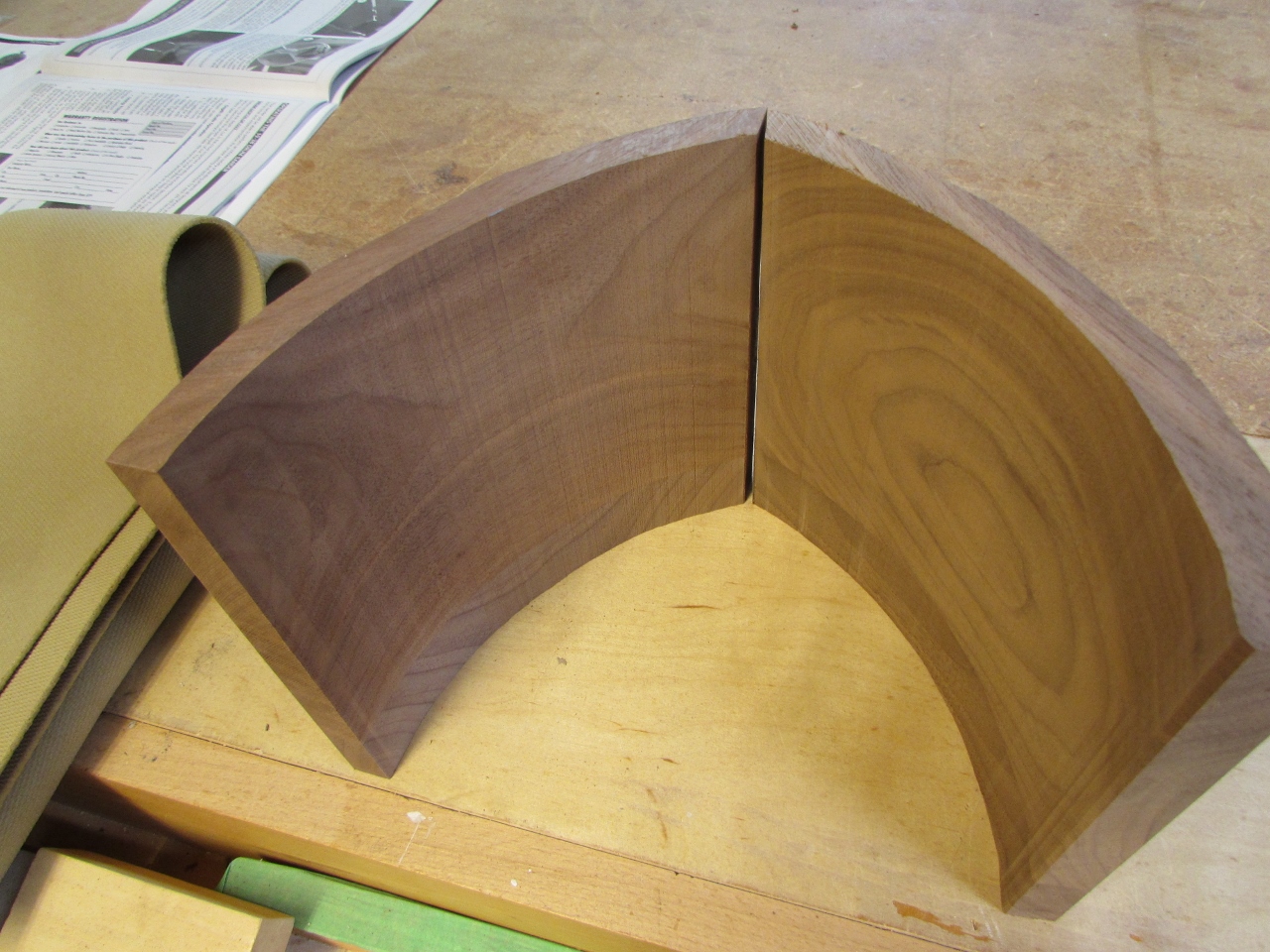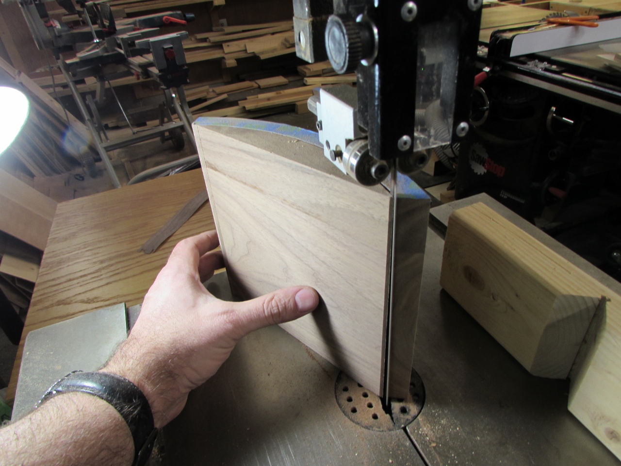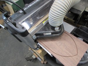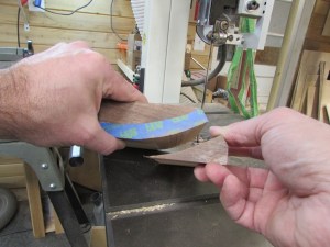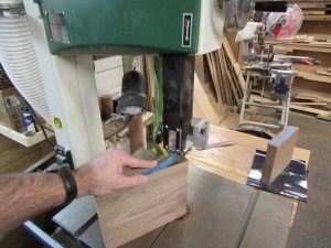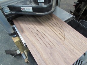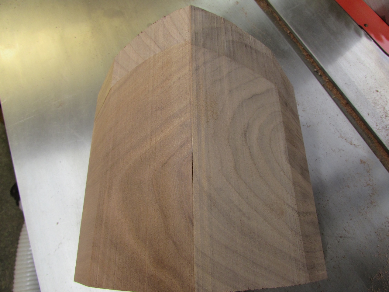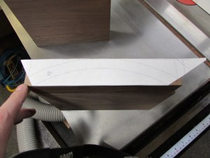 I figured I would tackle the arch-top first, since I think that will be the hardest to get accurate. My first thought was to steam bend, or do a laminated glue-up. But, that would then be difficult to get the mitered ends cut accurately. Since the curve wouldn’t offer a good surface to project the angles from. I decided to start with a thick piece of walnut and try cutting the curve on a band saw. This offered me the option of cutting my mitered ends before cutting the curve. Improved accuracy, but wastes wood.