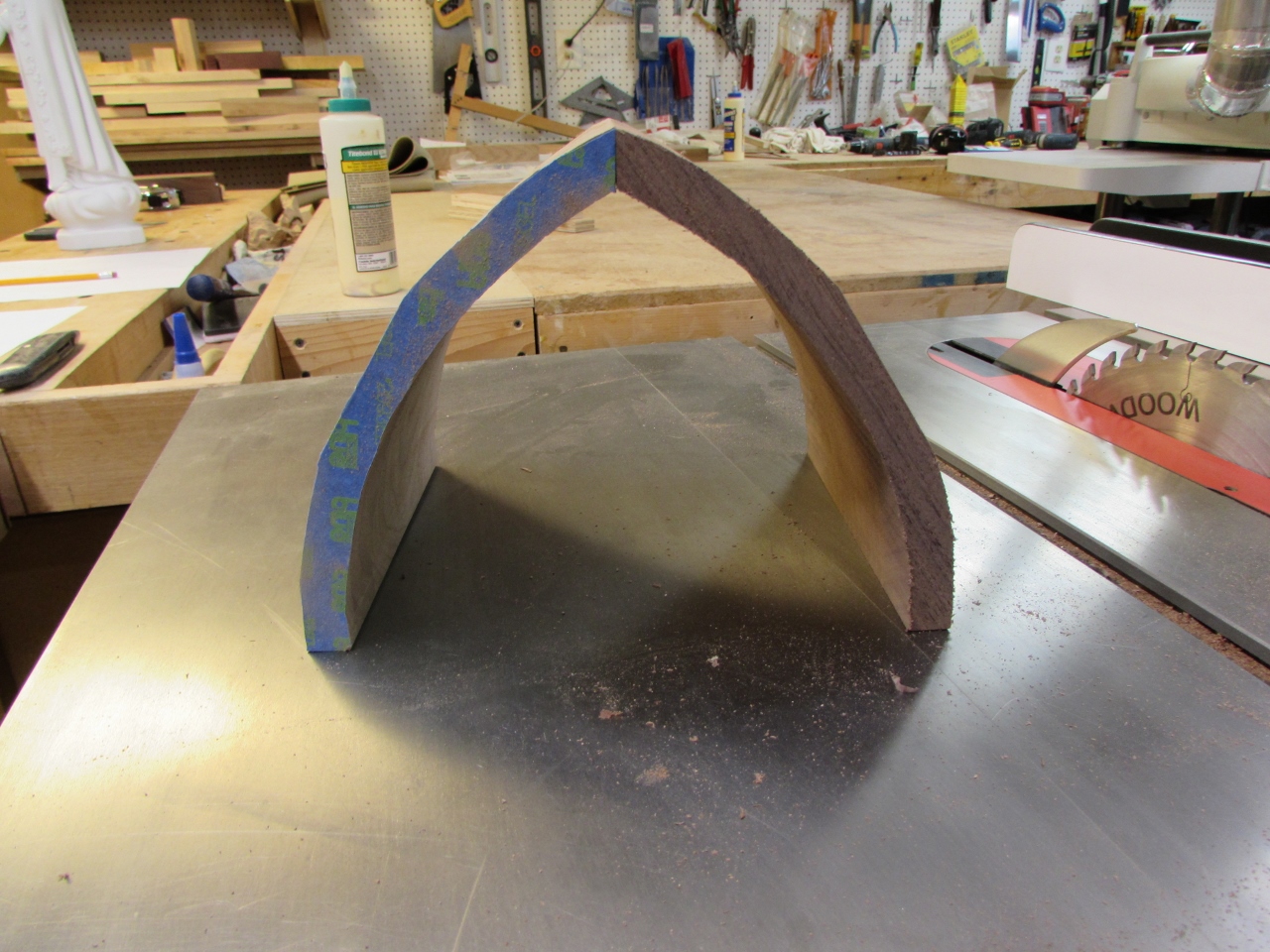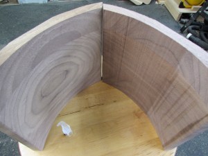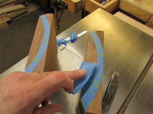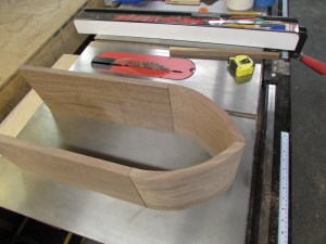 This was a good place to stop for the night, since I really don’t know what I am going to do for joinery yet. Mainly I am concerned about the best way to join the side to the arch. The end grain glue-up is not desirable, so some form of tenon or spline will probably be used. I will have to think on it…