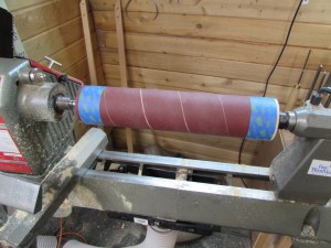I thought long about how to sand the inside curve. I am not really equipped for this, unless I want to hand sand it. Then I was inspired by my new drum sander. It has a long strip of sandpaper wrapped around a large cylinder. I thought maybe I could recreate this somehow, on my lathe.