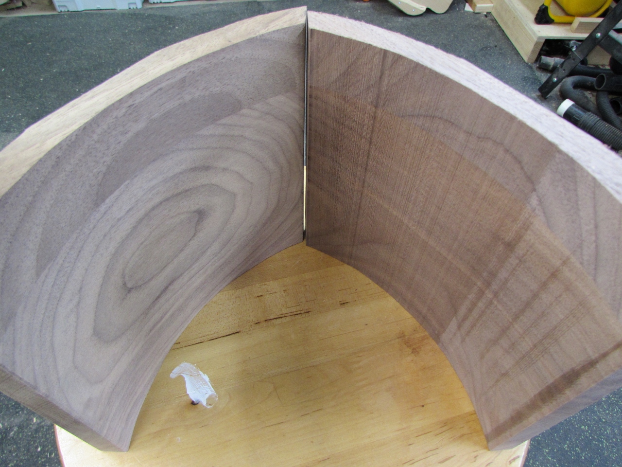 Unfortunately, there are some flat spots in the middle of the outside curves. I needed a slightly thicker piece of wood. Oh well, I should be able to blend that out with sanding. Sanding the inside curve will require some ingenuity, more on that in a bit.
