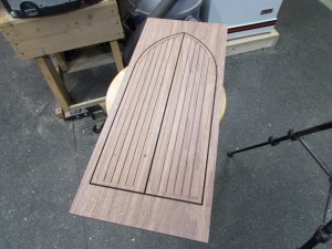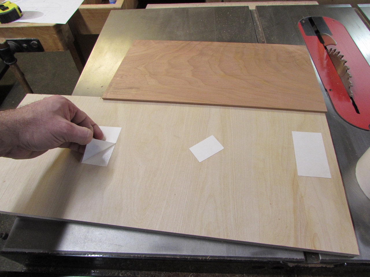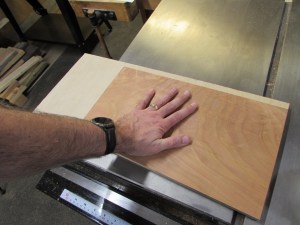 The cherry is too thin to go into the CNC, so I have to cut a backer board and attach the cherry to it with some double-sided tape. This will trick the CNC into carving it…