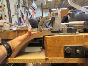 I clamped one side of the arch top to my bench and checked it against the lowest height setting on my Domino jointer. It was a little too tall still, so I made a spacer to make up the difference.
