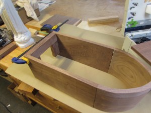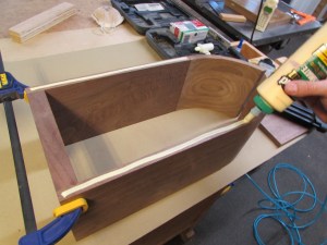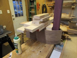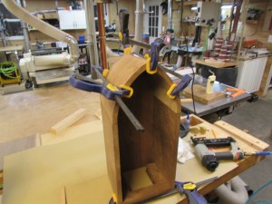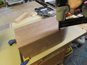 I clamped my base retainer to the bottom of the sides and flipped the assembly over. I added glue the back edge of the sides, and used brad nails to attach the back panel to them. I did not put any glue or nails on to the arch top yet.