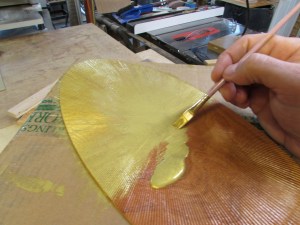 I applied a coat of acrylic, gold paint to the sunburst (I hate covering up that beautiful grain, but I need the gold color). While it was drying, I also hand-sanded the front doors.