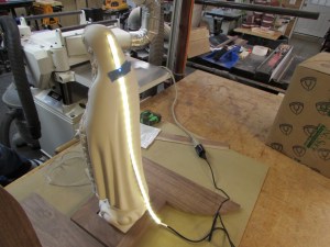 I have a plan to mount the lights to a strip of metal, that I can bend and adjust, but for testing, I just taped the strip to the statue.