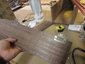 Now it was time for the hardware installation. I picked out some hinges, pulls, and catches that I thought would work well with this design. I also had to buy matching screws since the hardware doesn’t always come with them. I have also determined that buying steel hardware that matches the color is often better than using the screws that come with the hardware. They tend to be softer and strip out or break.