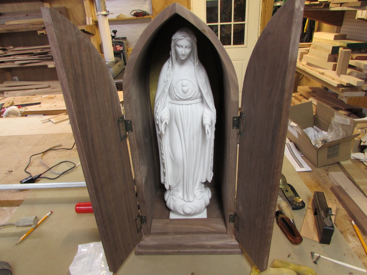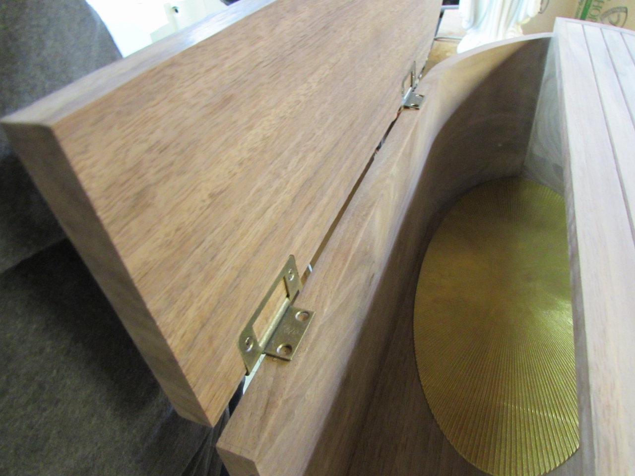 Once installed, I had to trim the doors a bit to match the slightly imperfect curve of the cabinet top. This was done rather aggressively on my spindle sander.
