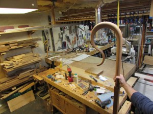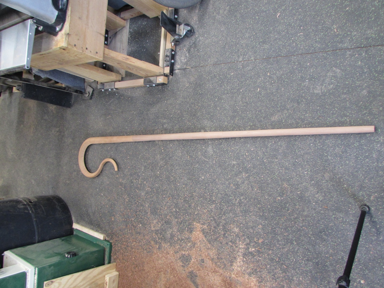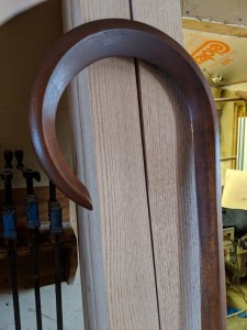 I handed the crosier back over to Dave. He worked with his machinist friend to correct the sockets and create a perfect connection, then did some finish sanding and staining. Unfortunately, the head piece dropped onto the floor, at one point, and broke off the re-curved end.