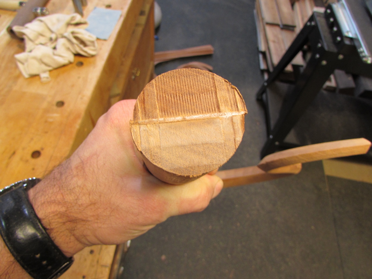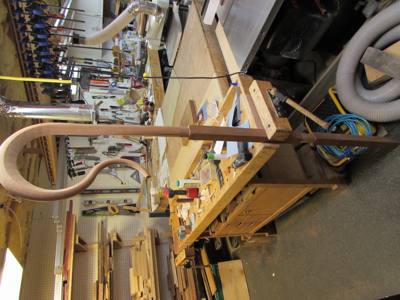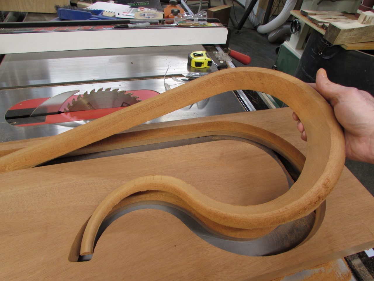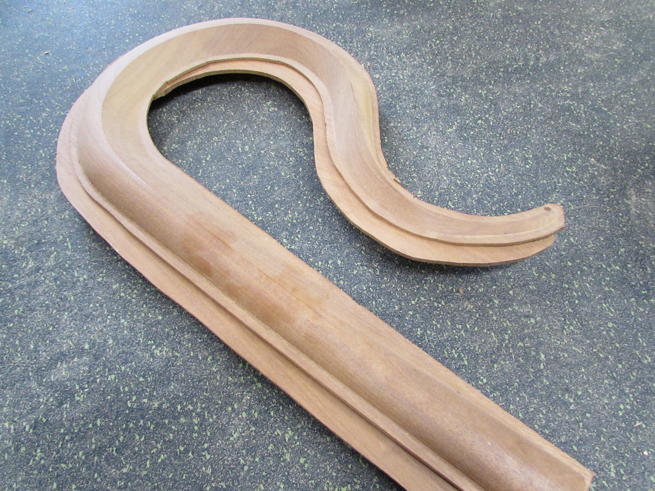 I tried to mimic Dave’s design as well as I could, but his piece of Sapele had some wonderful cross grain at all the right places, my piece was really straight grained and I worried that it would make the re-curved piece at the end rather weak.