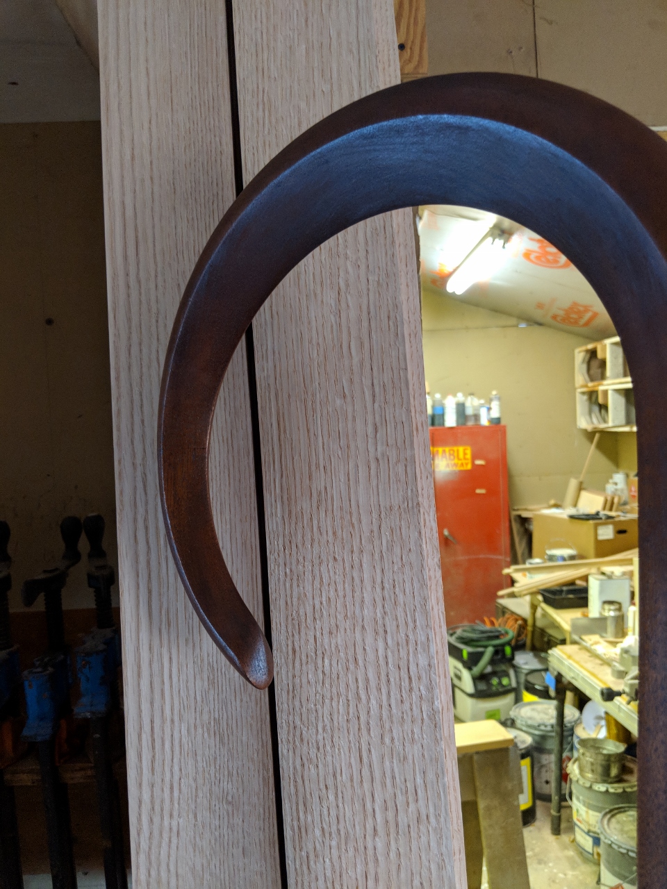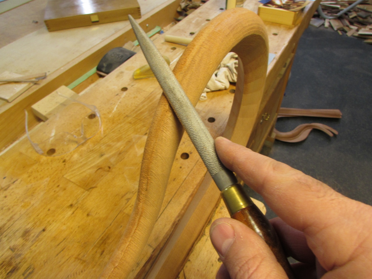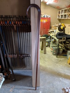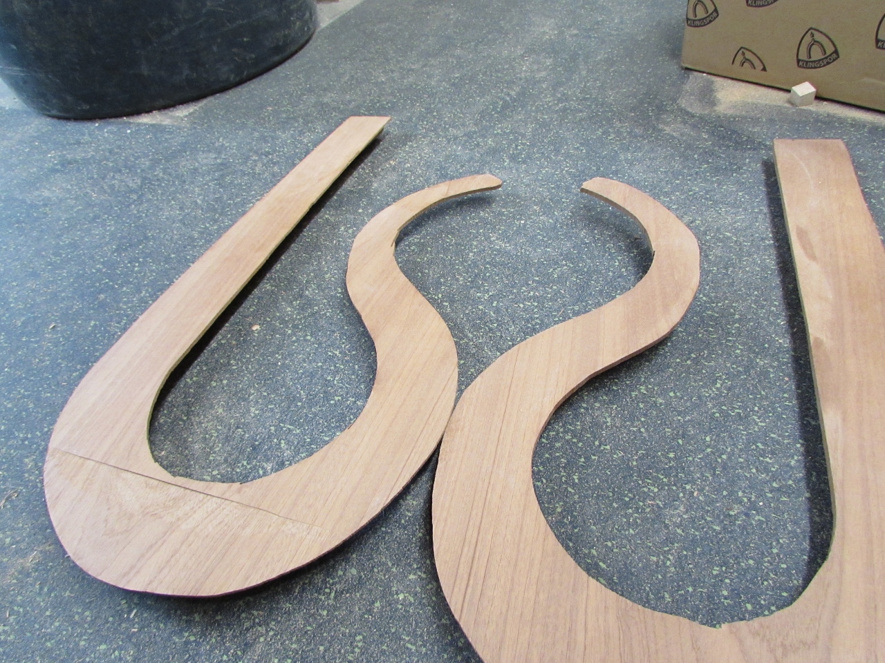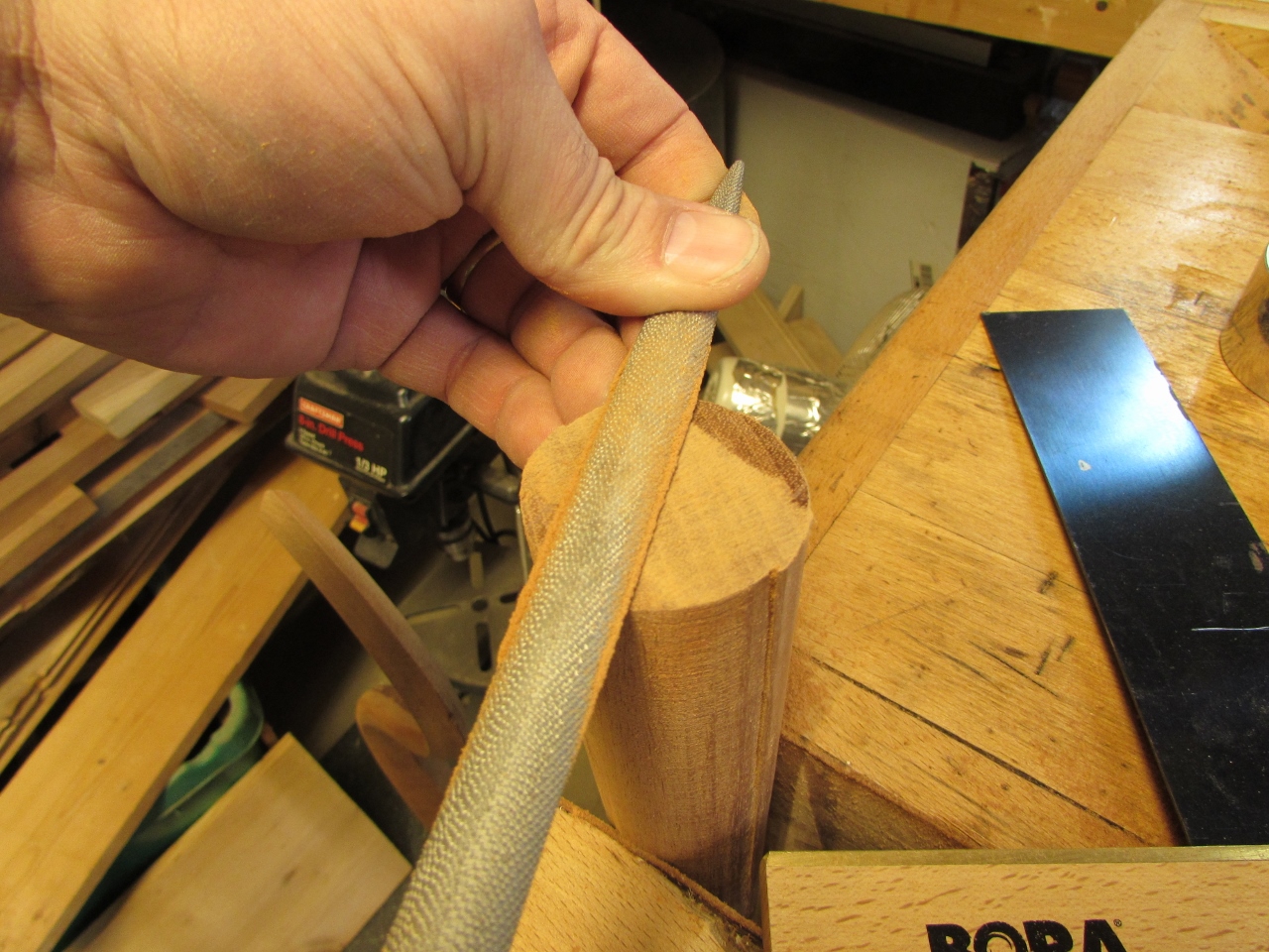 I tried to mimic Dave’s design as well as I could, but his piece of Sapele had some wonderful cross grain at all the right places, my piece was really straight grained and I worried that it would make the re-curved piece at the end rather weak.
