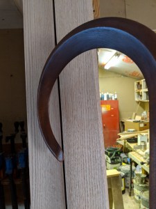 The crosier finished out about 6′-2″ tall and about 2-1/4″ thick across the top, tapering down to 3/4″ at the bottom. The three sections separate and fit easily into a mandolin case for transport.