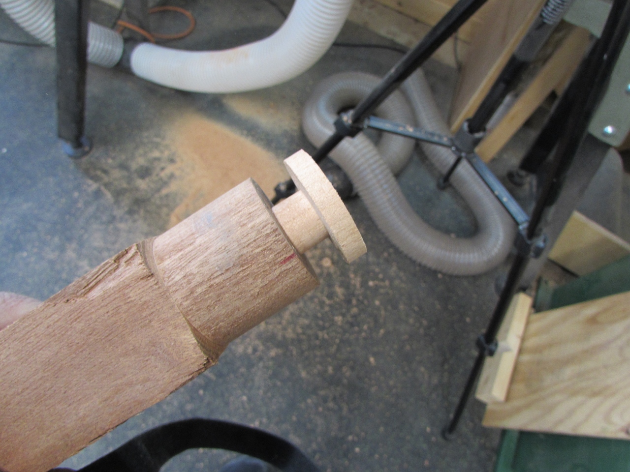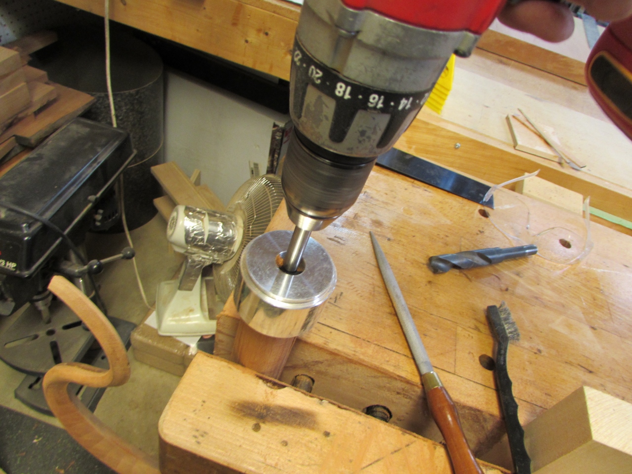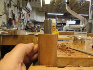 The staff will be taped down from 1-5/8″ to 3/4″ at the bottom. Since I started with 1-3/4″ at each end of the staff sections, then drilled and epoxied the pins in place, I now had to figure out how to hold the leg sections on the lathe and take them down to size. I immediately thought of how I used bushings to turn a pen.