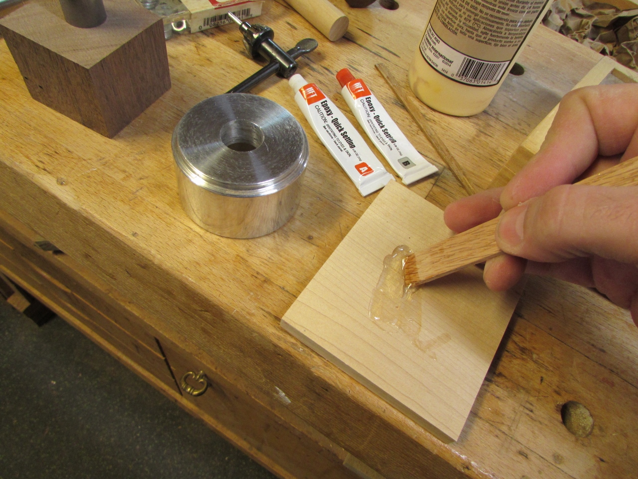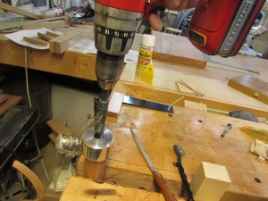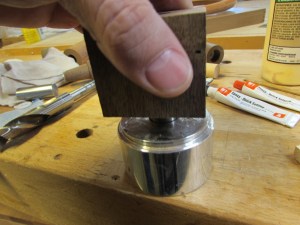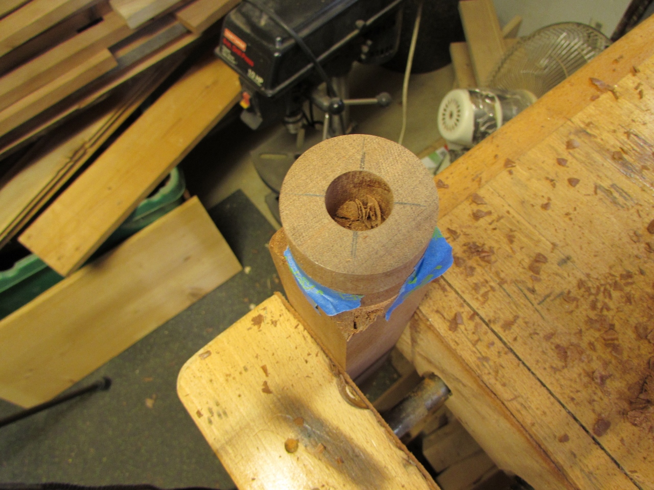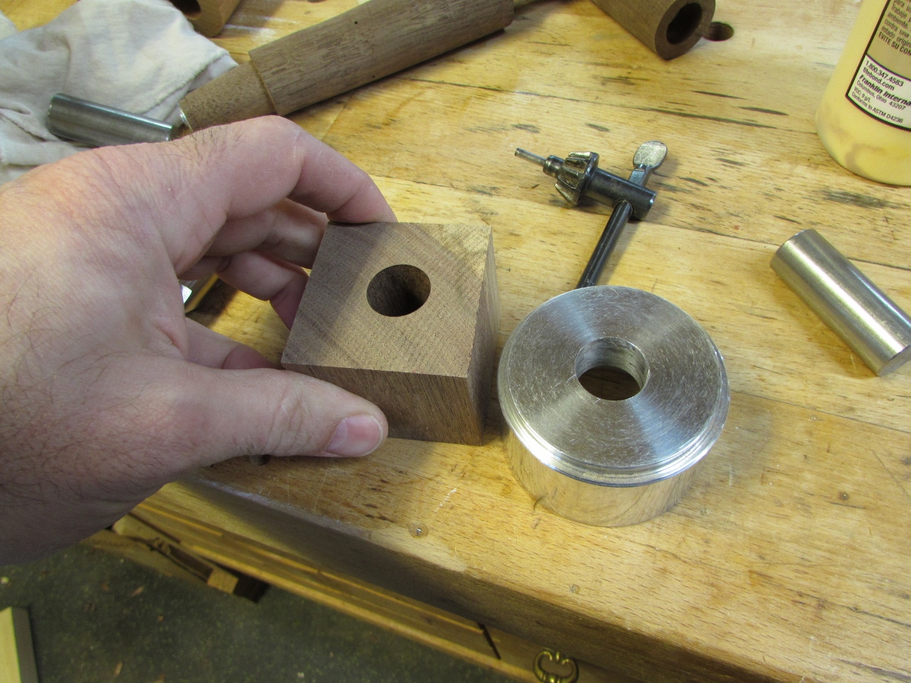 Obviously the 3/4″ section of my jig needs to be several inches longer… I cut a 2″ cube of walnut and drilled a 3/4″ hole through it, on the drill press.