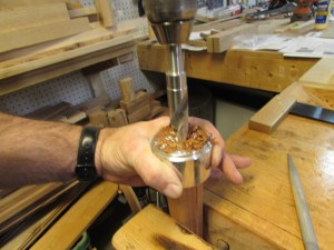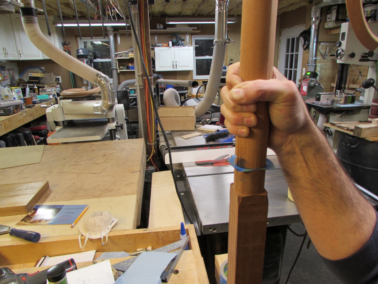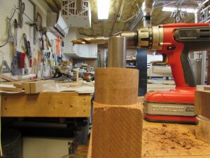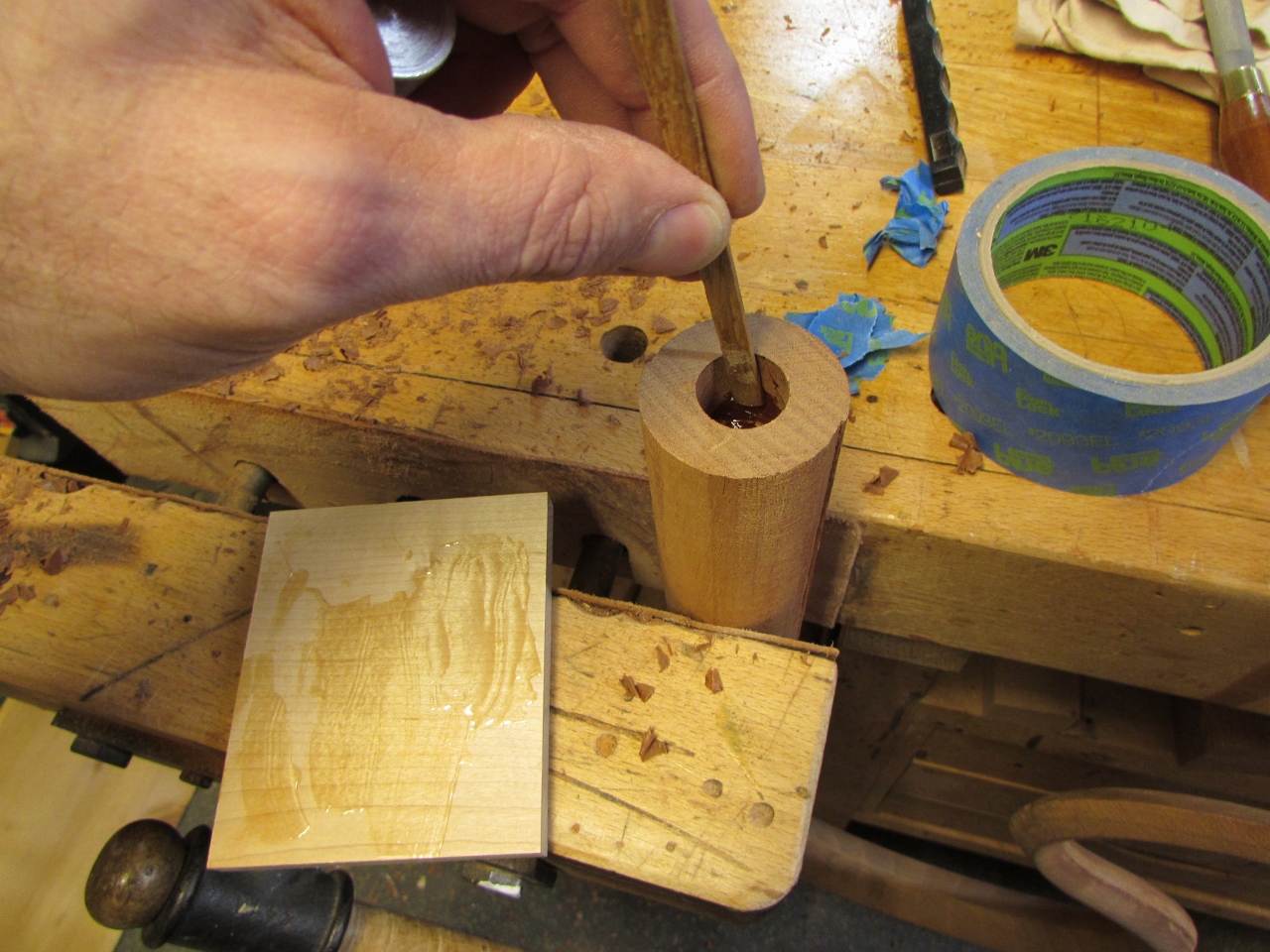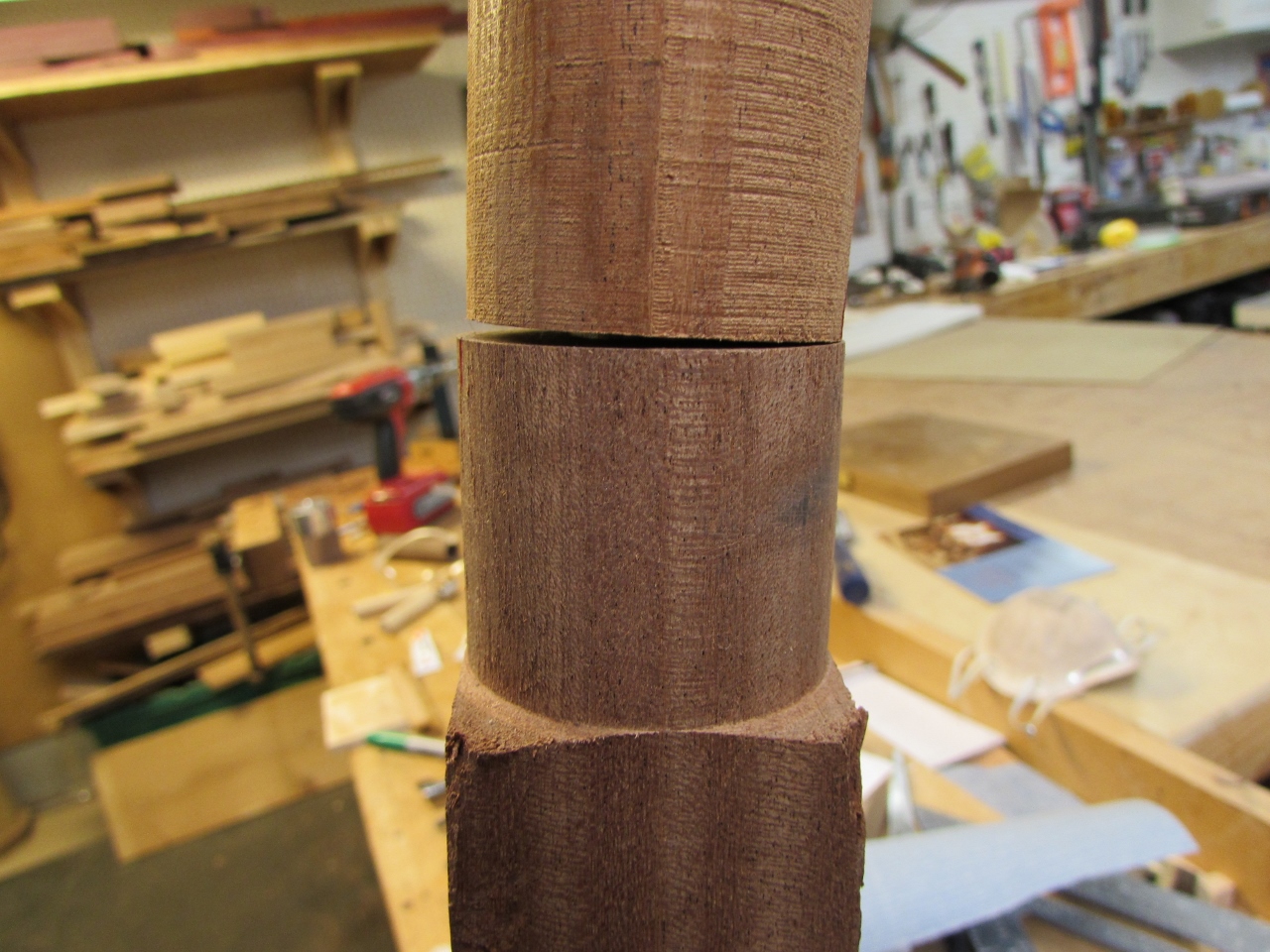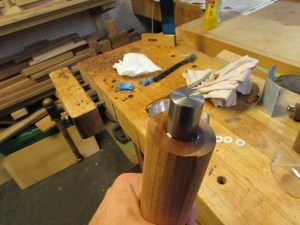 Once everything had cured, I fit them back together. When the grain was aligned, it was a perfect fit, but when I rotated one side 180 degrees, you could tell that it was not perfectly drilled. I spoke to Dave about this, and he said to proceed anyway, he has a plan to place the finished sections into a friend’s metal lathe and drill the hole larger, then set a brass tube in the hole creating a perfectly perpendicular socket that will not wear out as quickly.