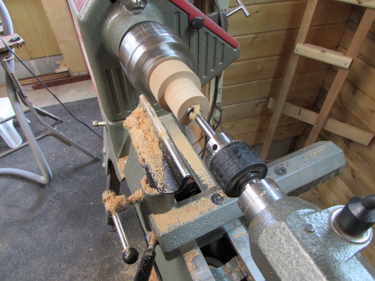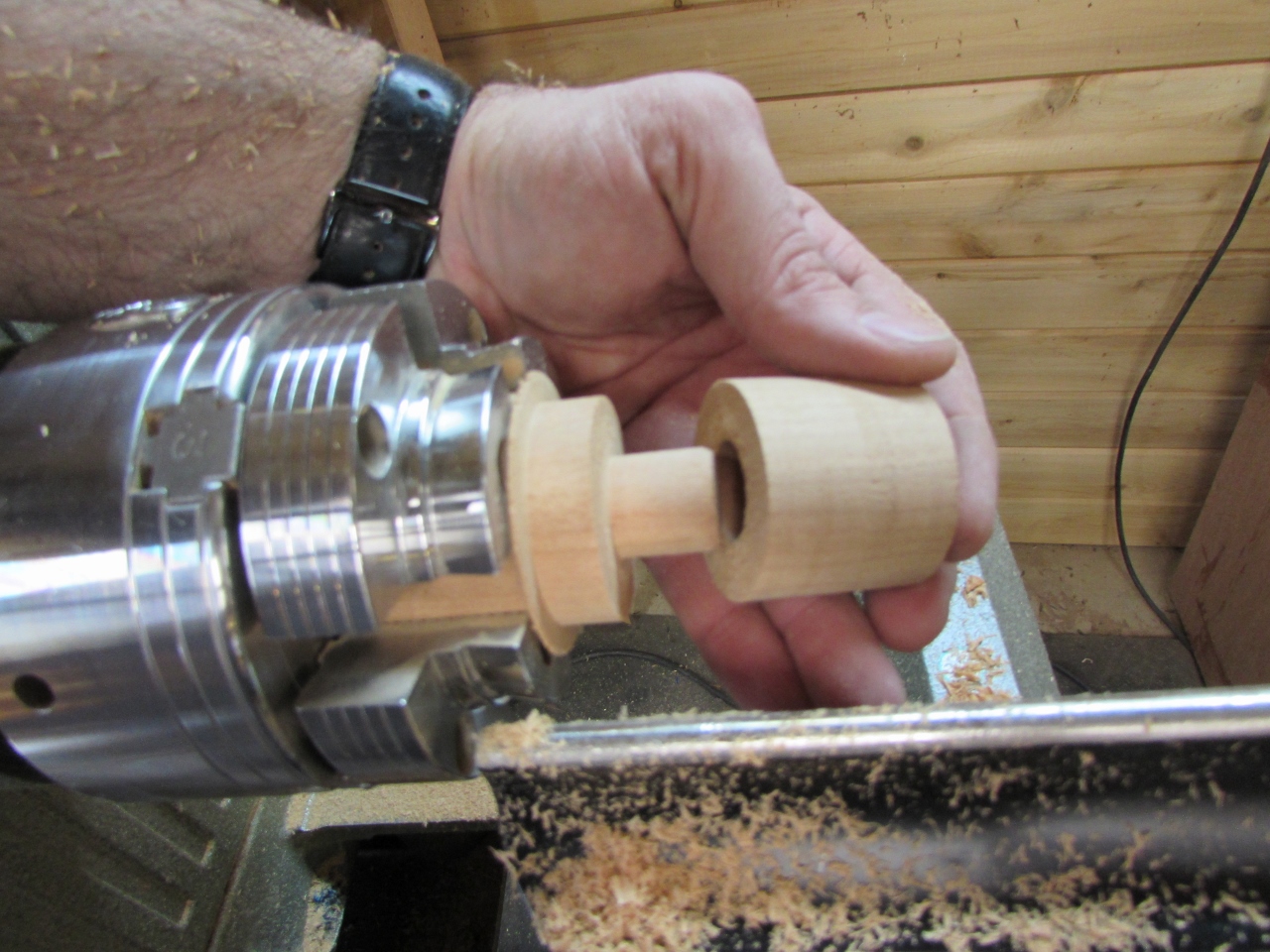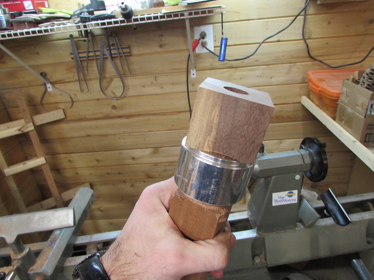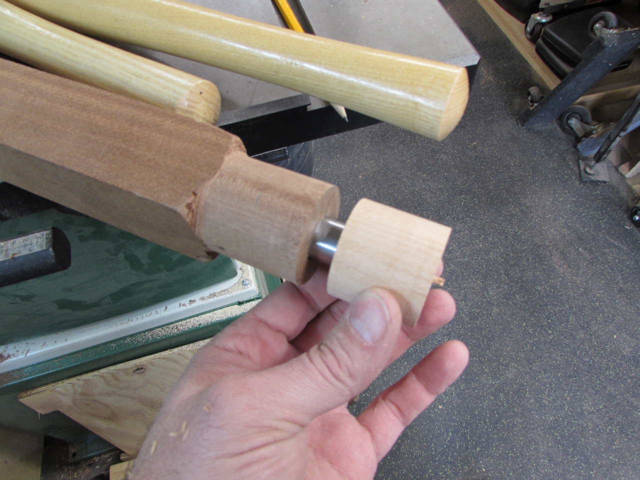 Then I inserted the 1-3/16″ male bushing into the end of the bottom staff piece and didn’t bother with a bushing on the other end. The very bottom was cut down to 3/4″ and the hole left in the end from the live center, in the tail stock will be the location for us to screw on a rubber or metal tip when it is all done.