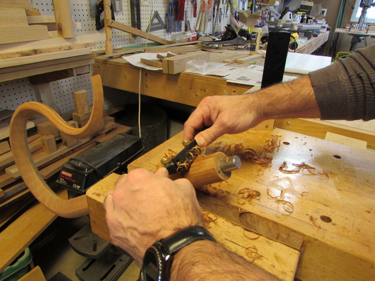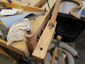 I took a break from the connections for a bit and spent some time cleaning up the end of the carved section, using a spoke-shave to take the connection end down to the 1-5/8″ diameter that I would be turning the thick end of the staff down to.