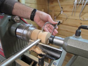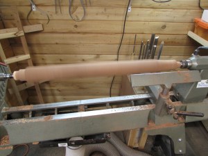 Remember, at this point, I am making this all up as I go along. I am sure there are better ways of doing this, but you have to start somewhere. I centered each leg section on the lathe, and cut a 1-3/4″ section on each end.