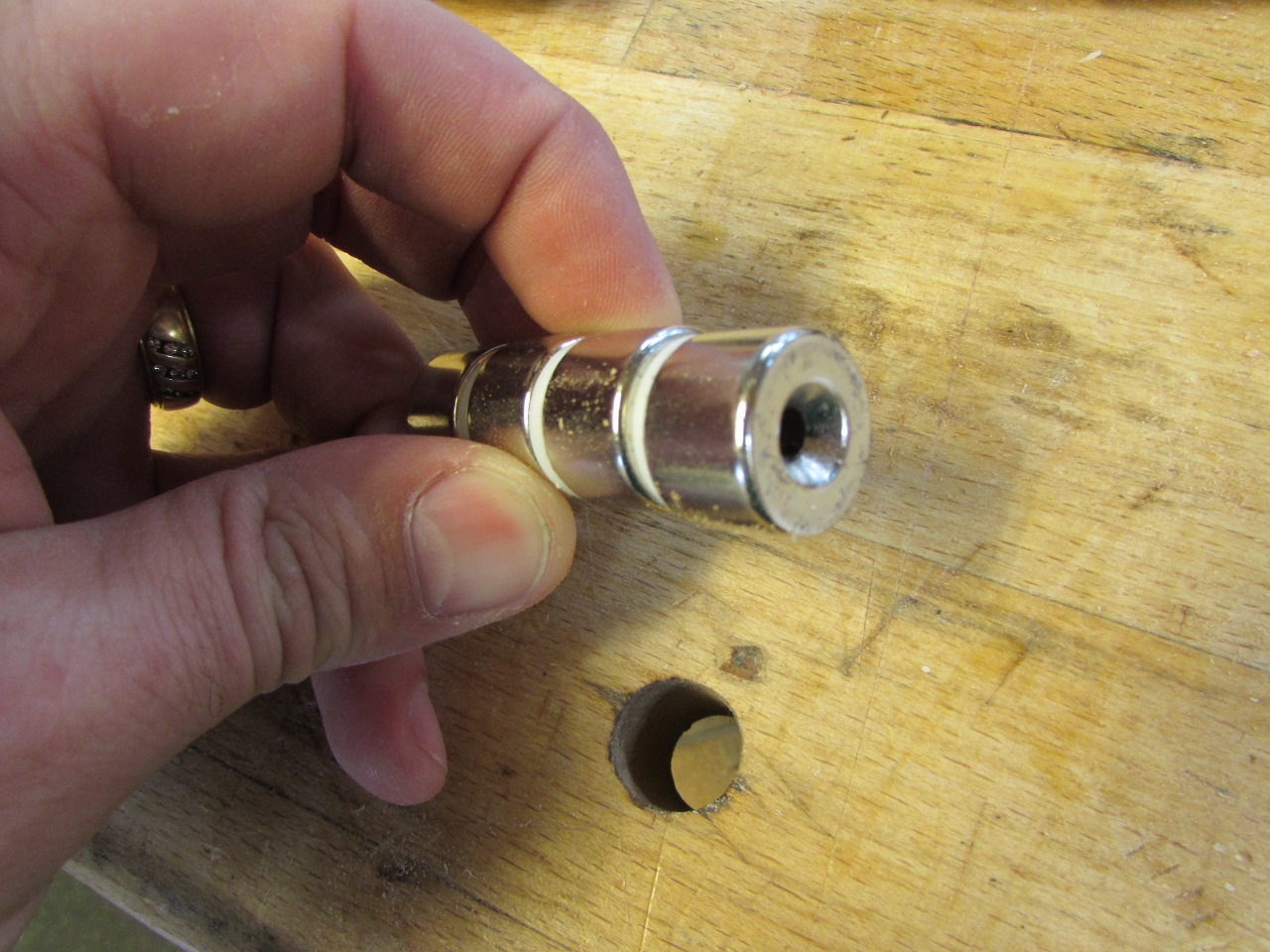 I thought about it a bit and decided to play with magnets. It seemed like a pain to screw together all the sections and pool cue hardware is not the strongest if it gets stress on the joint. I had a few 3/4″ diameter, 25 pound pull magnets, that I thought would work perfectly. My first concept was a tapered connection with a magnet at the bottom of the socket and a steel washer at the tip of the male end. I made a proto-type that worked perfectly. Check out the short video below.