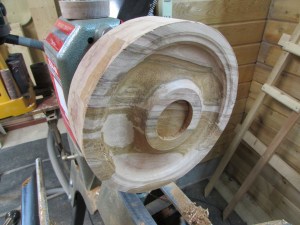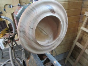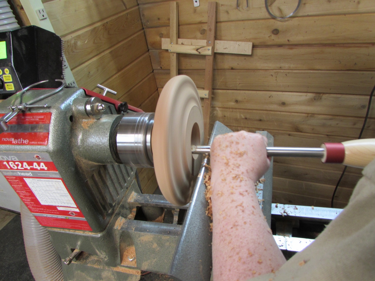 The first step was to cut a 2″ diameter hole into the face, slightly angled to receive the dovetail of the chuck jaws, once the bottom was more complete.