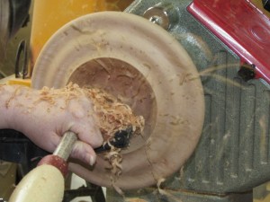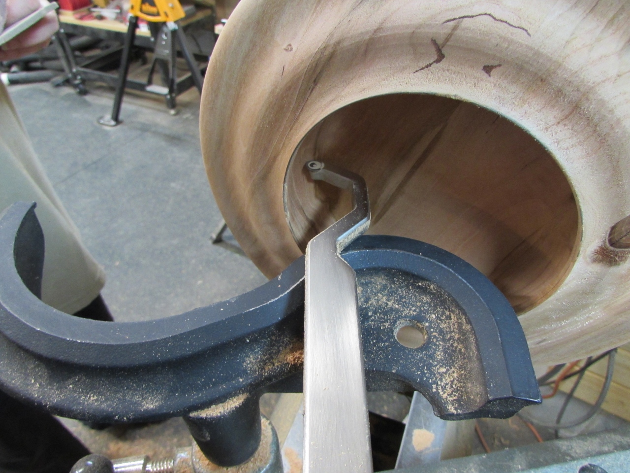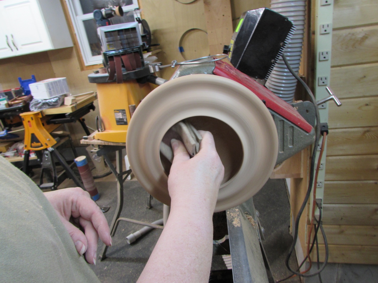When she had finished roughing out the bowl shape, and scraped as far into the side as she safely could with the scraper, Tracie switched to a hollowing tool that I bought for her. It allowed her to cut around the corner a bit more, thinning down the sides further.