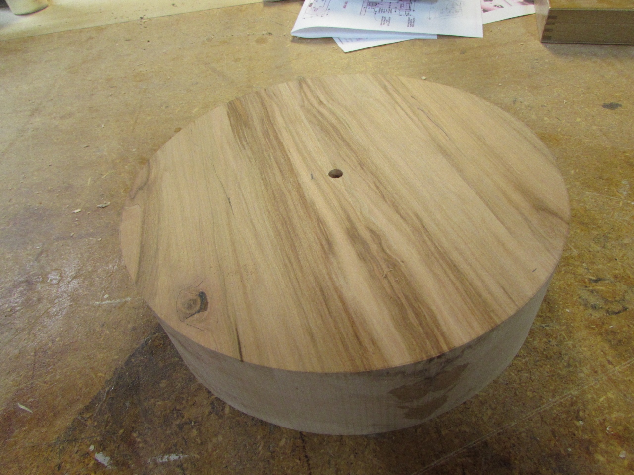 I started with some rough 3″x3″ stock, that my buddy Dave cut for me several months ago. It has been drying under my workbench for a while and the moisture content is now low enough that I won’t have to worry about it shrinking. I planed down one of my 3″x3″s and cut it into 10″ lengths, and glued them together. When it was dry, I cut the panel into a circle on my bandsaw.