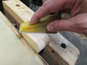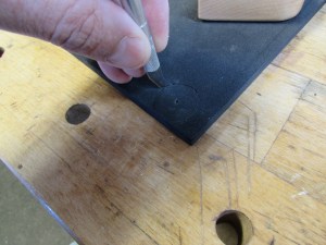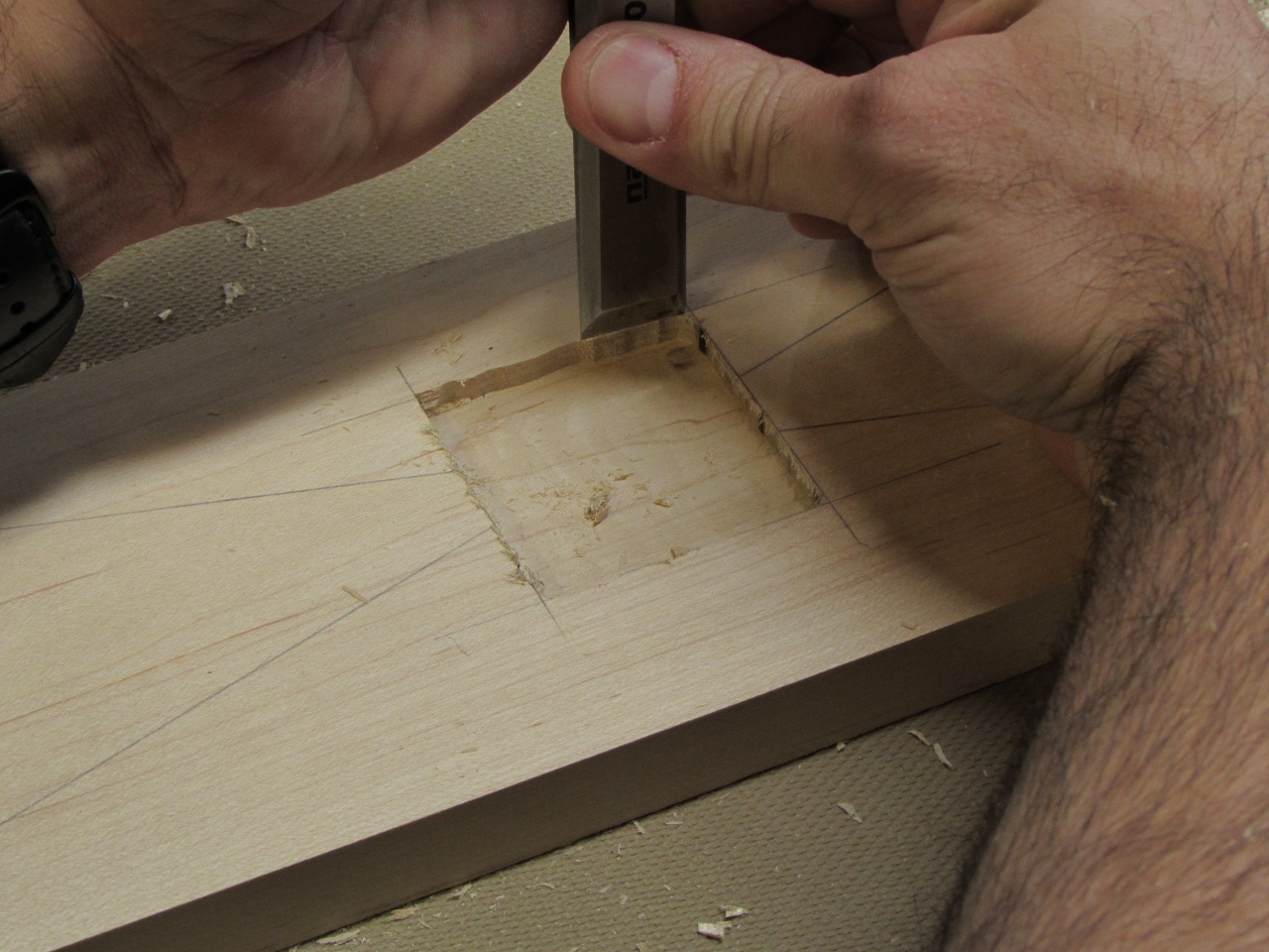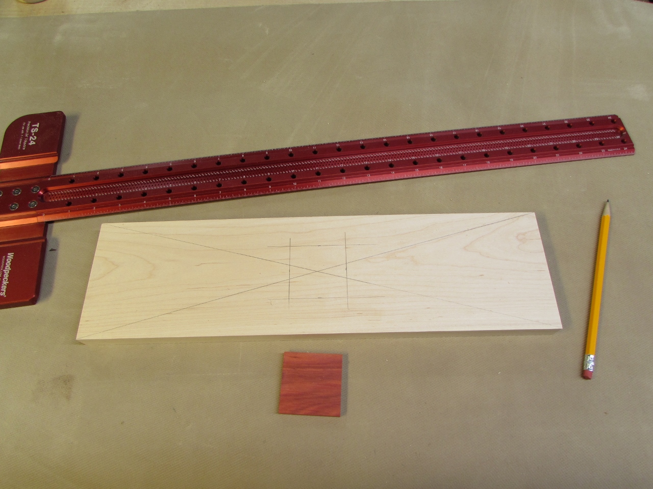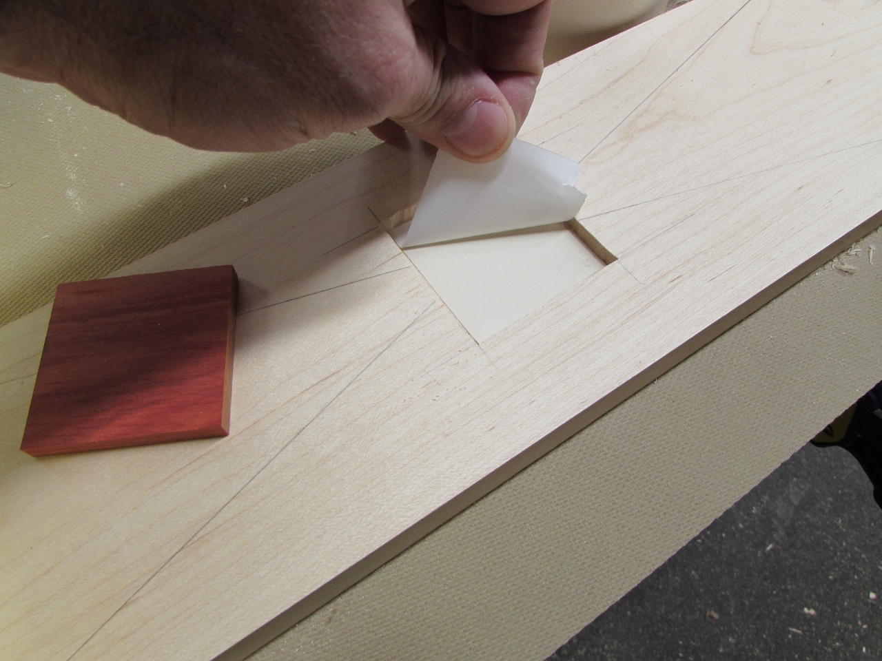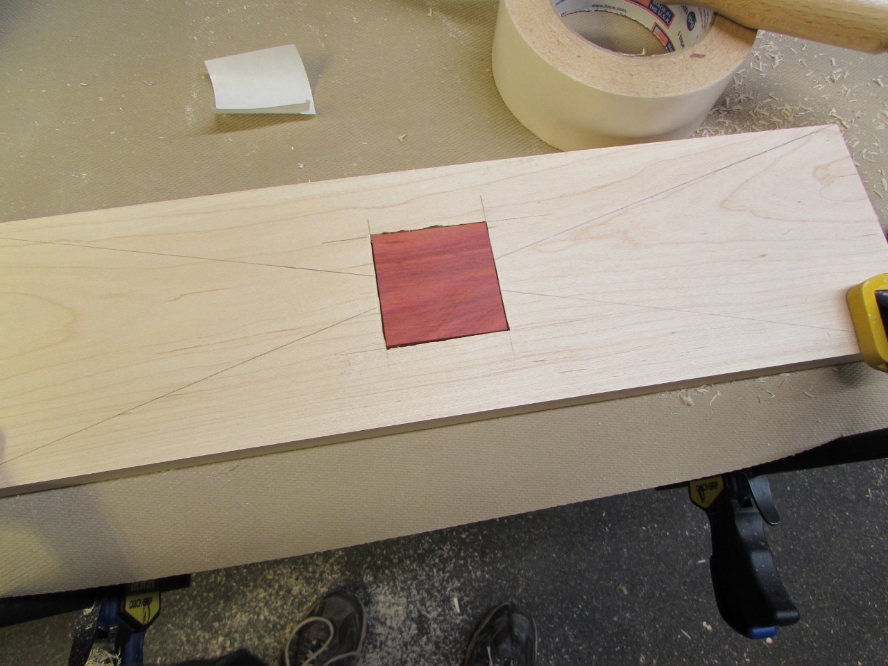 The redheart will have to sit flush into the maple board, so I took my time laying out a 2″ square in the center.